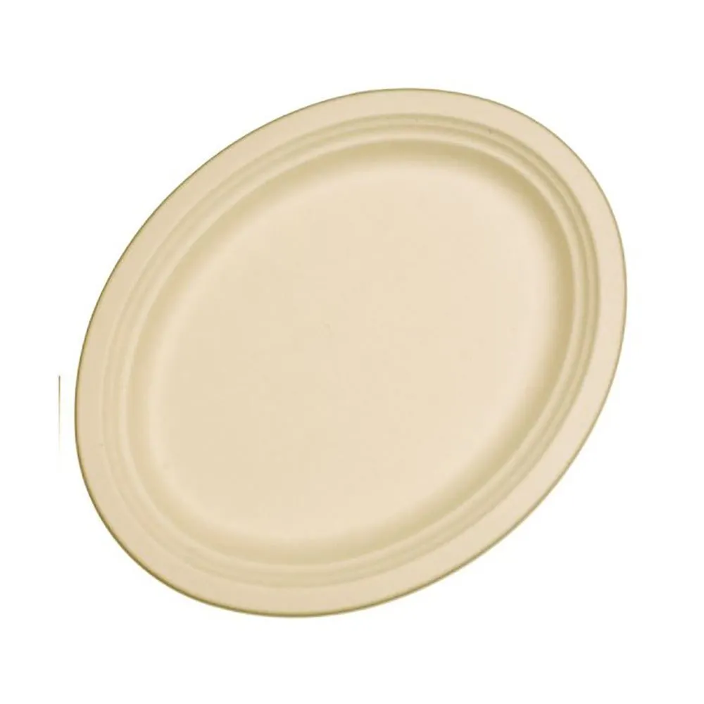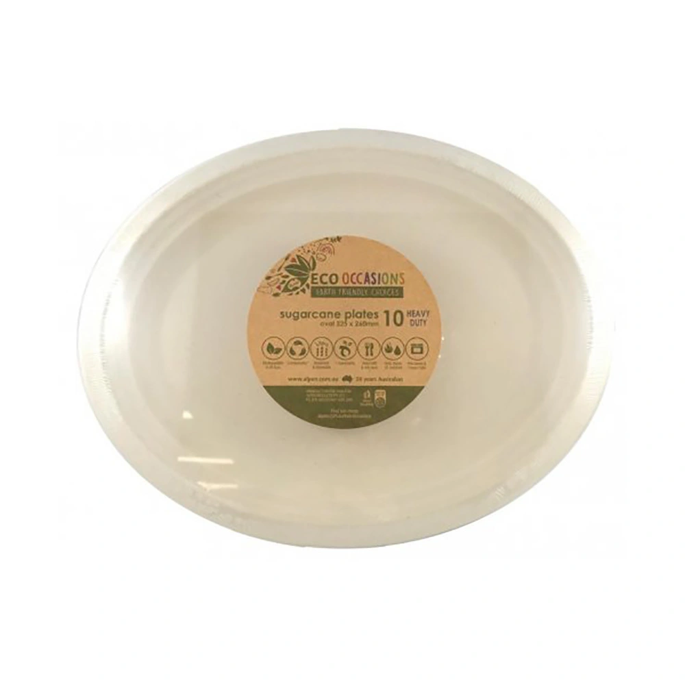 Includes 10 Sugarcane Oval Plates Natural Measures 325x260mm High-Quality Coordinate with other party supplies and party tableware Our new EcoOccasions Sugarcane Tableware is made from 100% natural sugarcane fiber. Sugarcane fiber (also known as Bagasse) is the dry pulpy residue left after crushing sugarcane stalks and extracting the juice from cane sugar. Sugarcane pulp is an excellent alternative to wood. While the paper is produced from pulping wood from trees, Bagasse is the reclaimed byproduct of the huge sugarcane industry. Re-production using bagasse is more environmentally friendly than Styrofoam or even recycled paper to produce, requiring less water and less energy. The fibrous nature of bagasse makes it easy to mold into many shapes and sizes. It is compostable, in both home and industrial settings. And will 100% biodegrade within 90 days. When sugarcane products degrade, they provide natural ingredients back to the environment since they are made from natural materials. Being made from reclaimed and renewable resources, our tableware is the ultimate sustainable product. It is food safe and non-toxic, oil & heat resistant up to 100?C, leak proof, microwavable, freezer safe.