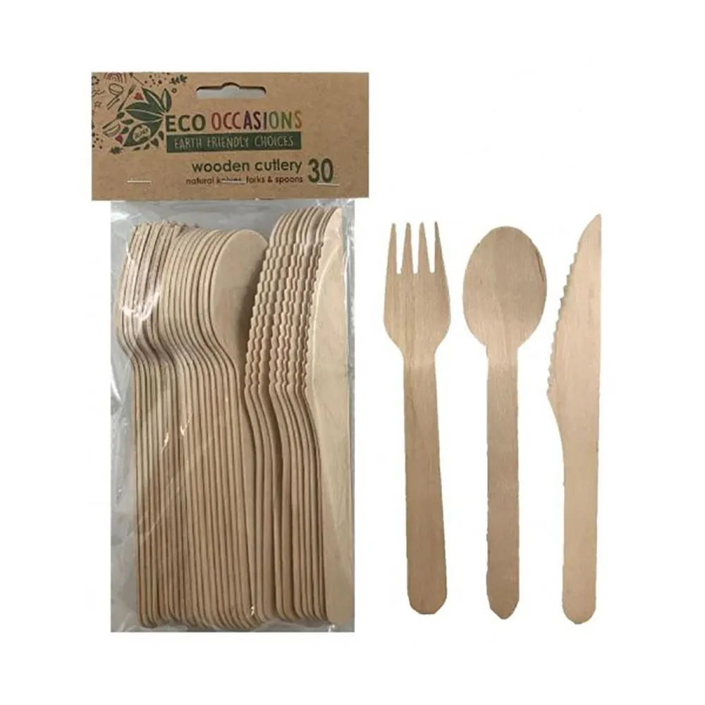 Includes 30 Wooden Cutlery Natural Set Measures Knives are approx 165mm tall and have a serrated edge. Forks & Spoons are approx 155mm tall. Wooden Cutlery is made from FSC accredited Birchwood. High-Quality Coordinate with other party supplies and party tableware