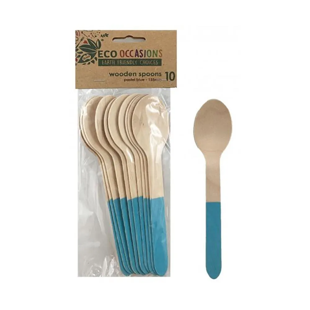 Coloured EcoOccasions wooden cutlery is a great addition to our ecooccasions sugarcane tableware, paper table cover and napkin range. They provide a fun, colourful touch to your event while still protecting the environment and making an earth friendly choice! Includes 10 Wooden Spoons Light Blue Measures 155mm High-Quality Coordinate with other party supplies and party tableware