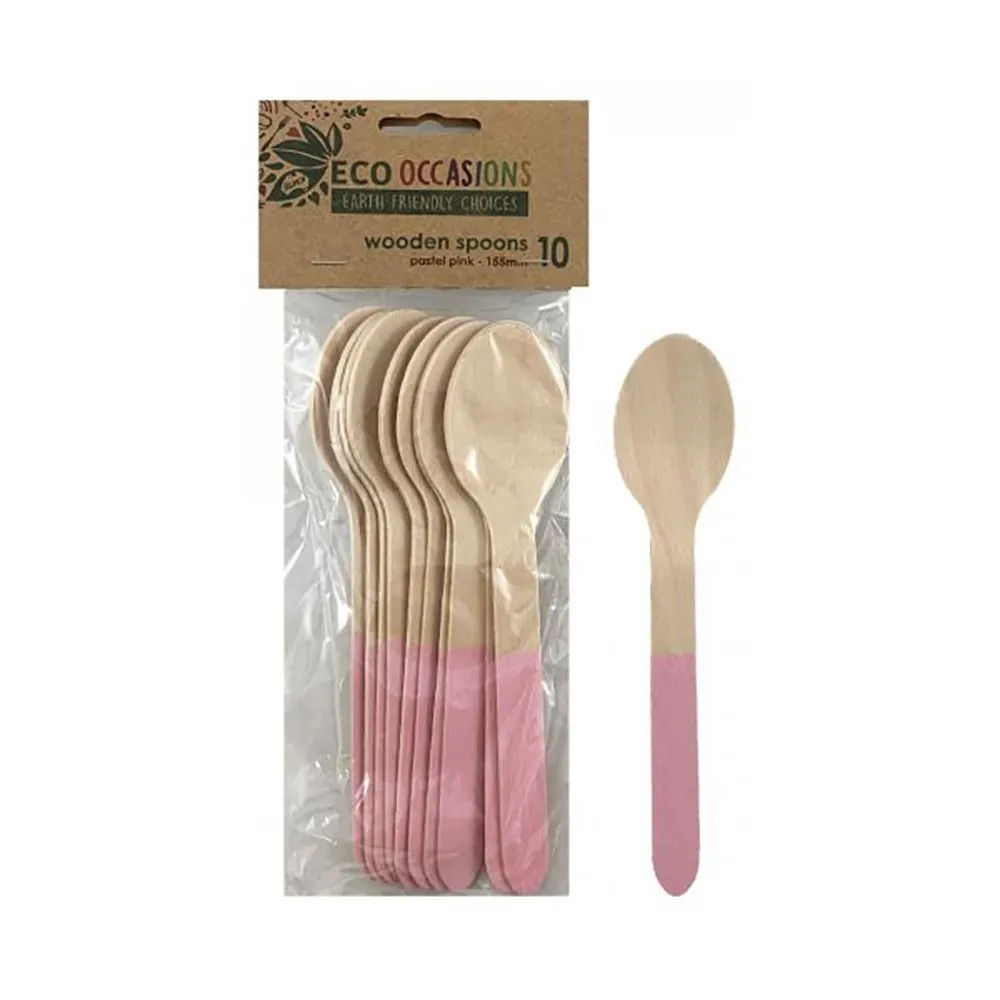 Coloured EcoOccasions wooden cutlery is a great addition to our ecooccasions sugarcane tableware, paper table cover and napkin range. They provide a fun, colourful touch to your event while still protecting the environment and making an earth friendly choice! Includes 10 Wooden Spoons Light Pink Measures 155mm High-Quality Coordinate with other party supplies and party tableware