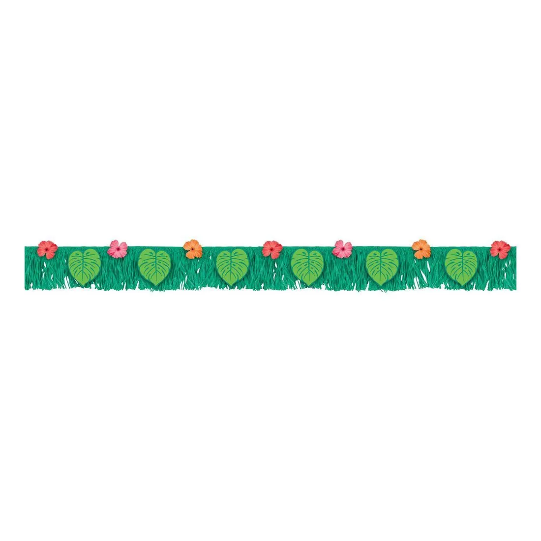 Includes 1 Tropical Jungle Fringe Banner with Palm Leaves & Flowers Contains: Plastic Fringe 22cm x 1.77m 6 x 19cm Cardboard Leaves 7 x Fabric Flowers Indoor or Outdoor Use High-Quality Perfect themed parties Coordinate with other party decorations and party supplies