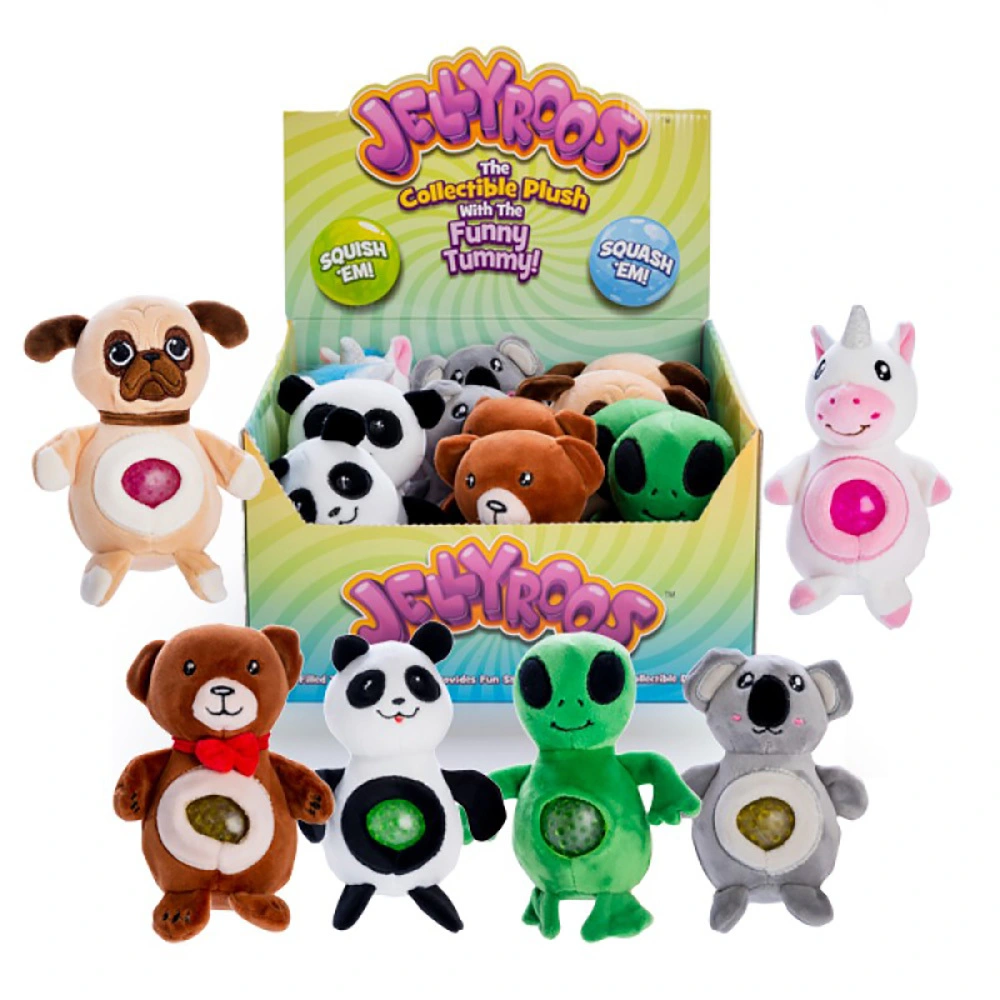 Includes 1 Jellyroos Best Mates Sensory Toy Measures 13cm x 8cm x 17cm Soft & fuzzy plush filled with colourful jellies that pop out of their bellies! Squish em and feel your troubles melt away 6 adorable designs: Unicorn, Panda, Koala, Alien, Teddy Bear and Pug Design Sent At Random High-quality