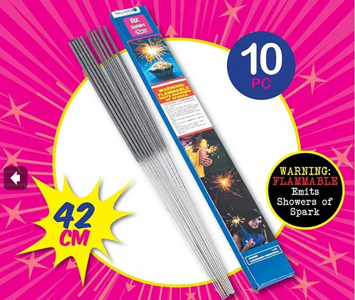 Includes 10 Sparklers Measures 42cm each Perfect for Birthday’s, Weddings and other events For Outdoor Use Only Follow Instruction Carefully. *Please note sparklers cannot be sent Express due to regulations. If you add sparklers to your express order, your shipping will default to regular post and a refund will be processed for the Express shipping portion.”