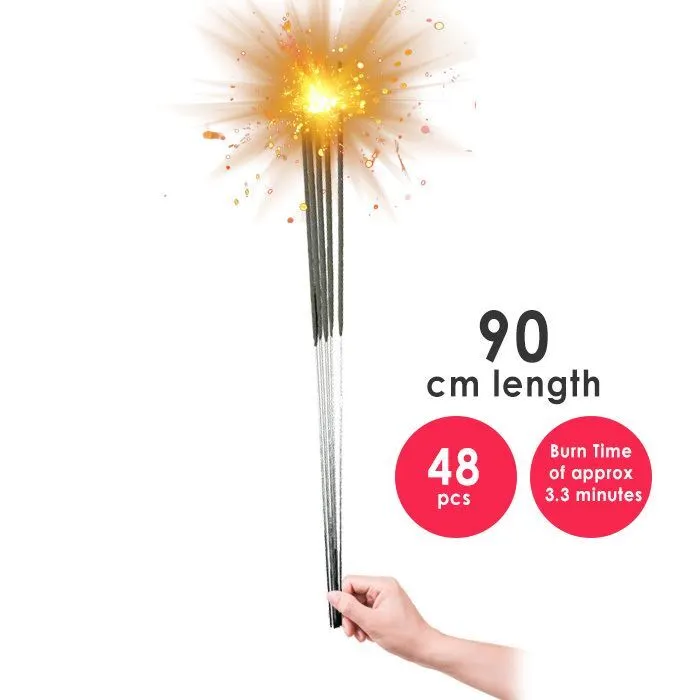 Includes 48  Sparklers Measures 90cm each Perfect for Birthday’s, Weddings and other events For Outdoor Use Only Follow Instruction Carefully. *Please note sparklers cannot be sent Express due to regulations. If you add sparklers to your express order, your shipping will default to regular post and a refund will be processed for the Express shipping portion.”