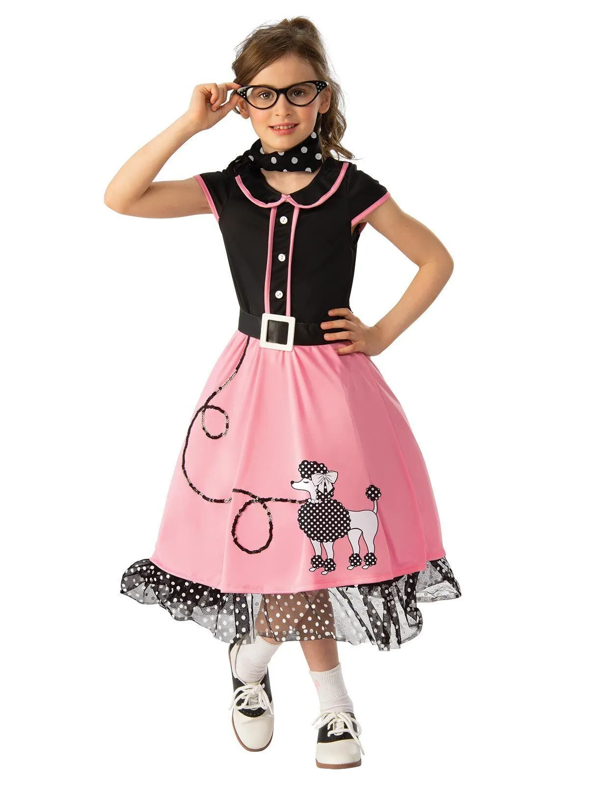 Available Online. For instore availability please call us on 07 3279 1555 The Vintage era, when it was all about polka dots, full skirts, neck scarves, high pony tails, “Greaser” leather jackets and dancing to the new sound of rock and roll. You are back in the 1950’s where fashion and fun went hand in hand. Dress to impress at your next themed decades party or rock ‘n’ roll dance partyINCLUDESA-Line Dress with Petticoat underlay in patterned tulle and featuring poodle design on skirt, rounded love heart collar and printed buttons. Dress has short capped sleevesFabric belt with silver buckle has velcro tabs at rearBlack and white polka dot neck scarf ties at the sideGlasses sold separately, item code 7583C_F, shoes and socks not included