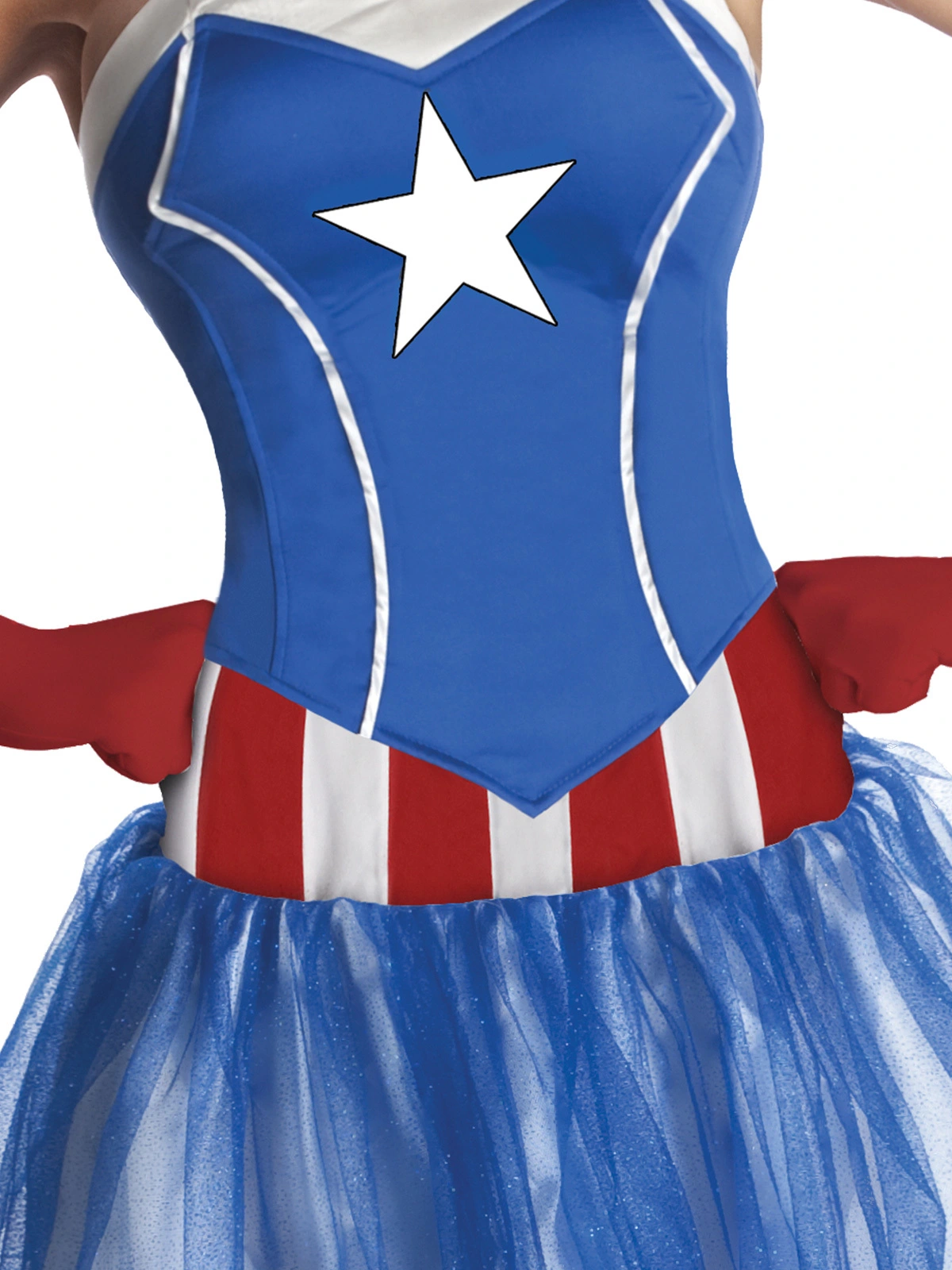 Available Online. For instore availability please call us on 07 3279 1555 Â American Dream – real Name Shannon Carter, alias American Dream, or the female version of Captain America. She’s the Leader of the Dream team and one of the hottest characters in the Marvel Cinematic Universe. Just like Captain America, she has a trademark American shield to combat the villains in Marvel’s comics. INCLUDES Strapless dress with a polyester bodice with piping, white panel across sweetheart hem and printed star on the chest. The dropped waistline has a panel with printed stripes and V shape with upper bodice panel Tutu skirt in nylon with glitter tulle overlay Opera length gloves Eyemask moulded with painted details and elastic band with velcro fastening. Boots not included This is an officially licensed Marvel product
