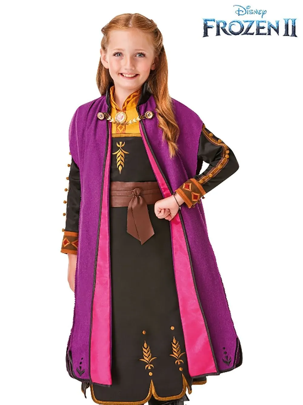 Available Online. For instore availability please call us on 07 3279 1555 “Do you want to build a snowman?” She is Anna, from the blockbuster Disney movies Frozen (2013), short films Frozen Fever (2015) and Olaf’s Frozen Adventures (2017) and now the NEW movie, Frozen 2 (2019). Featuring actor Kristen Bell, journey to Arendelle with your sister Elsa and friends Olaf, Kristoff and Sven. Together, you find the strength to reverse the curse that has plunged the kingdom into an eternal winter. Become the brave, stubborn but beautiful Anna and see what adventures you travel to in Frozen 2.INCLUDESCrepe satin dress with folkloric embroidery detail and separate belt, plus a mock shirt and collar with embroidery and 3D icon gem broochDress has embroidered suedette cuffs with satin covered buttonsWoolly, luxurious two-tone cloak with shimmer satin lapel plus collar with cape fastening and embossed buttonsJersey pants in legging style with textured detailsCertificate of authenticity with ‘official’ holographic sticker and silver foil print inside a deluxe velour pouch. This is a numbered limited-edition pieceCostume is packaged in a deluxe suit carrier with official swing tag and pants are packaged in a separate organza bag with silver ribbonBoots not includedThis is an officially licensed Disney product