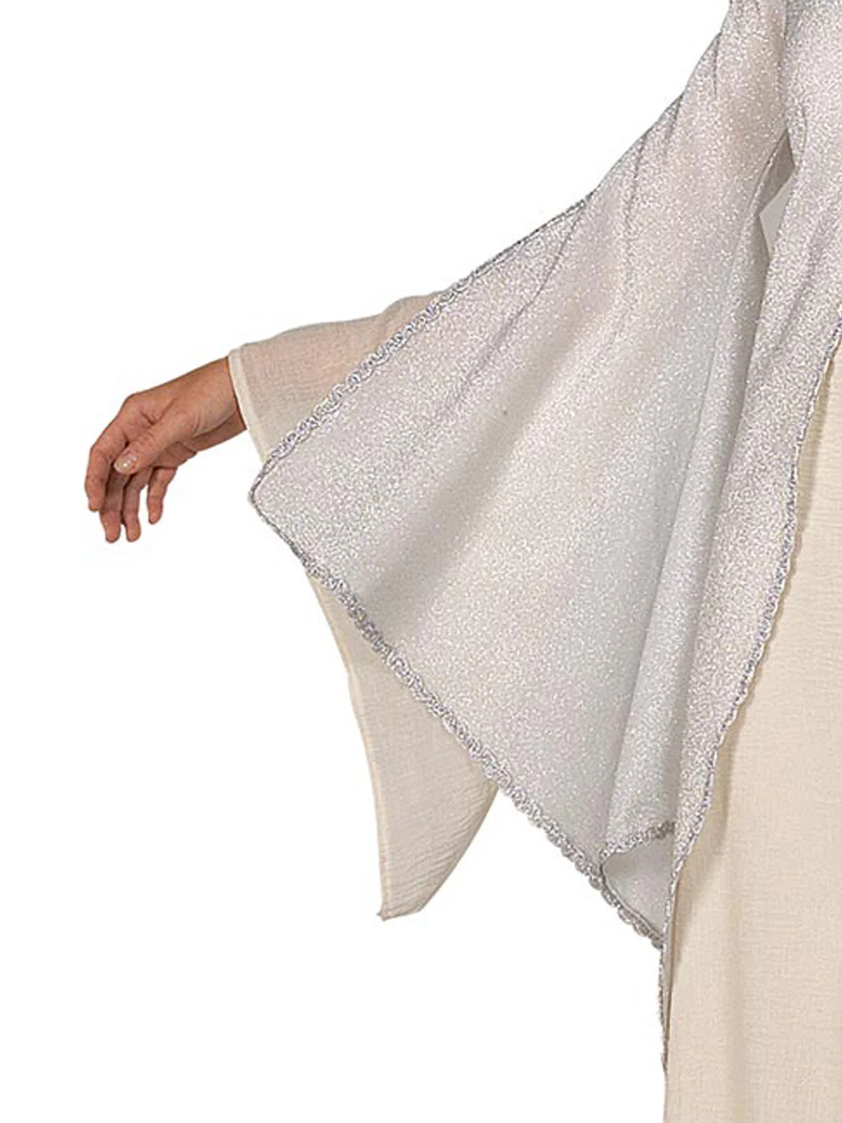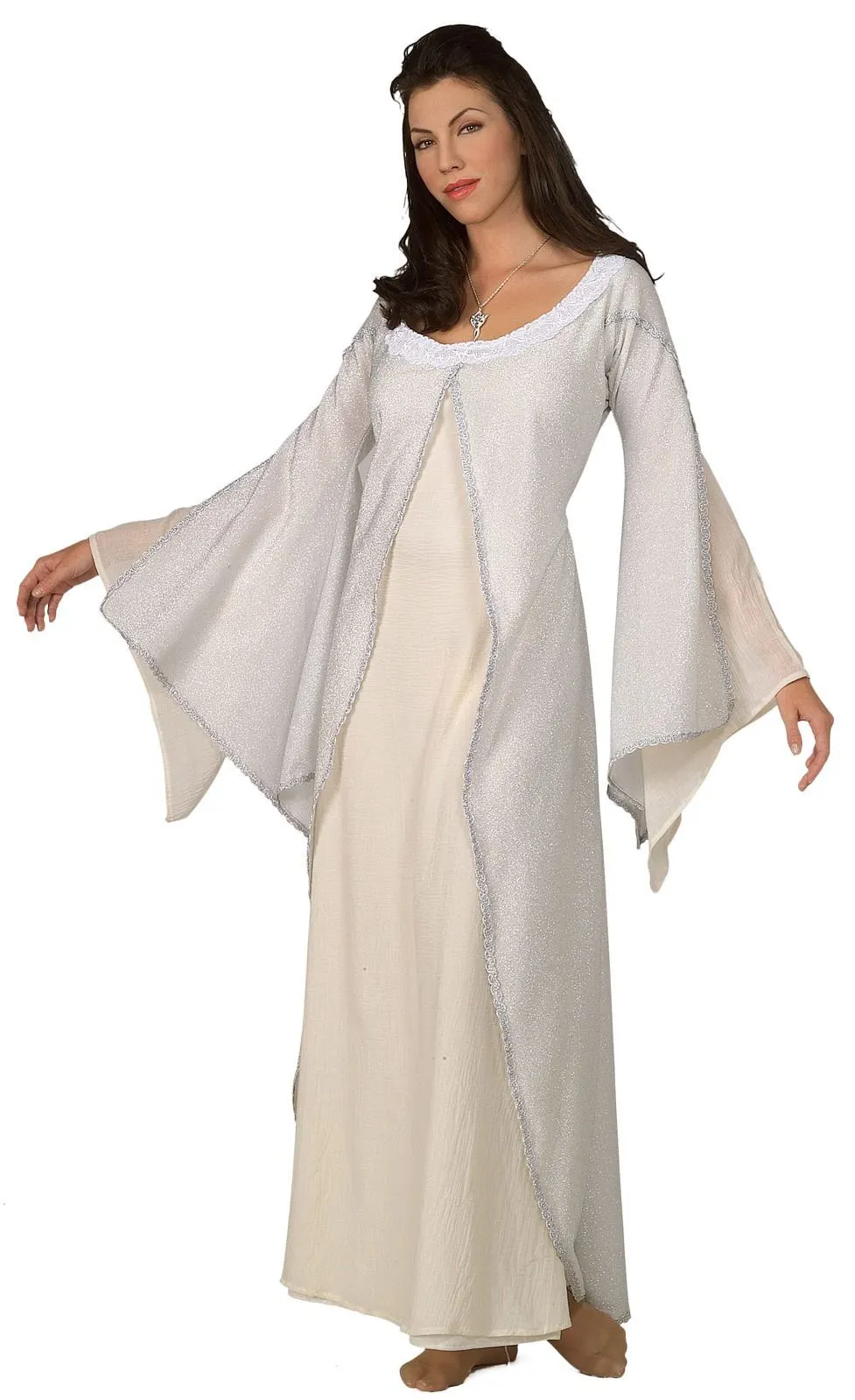 Available Online. For instore availability please call us on 07 3279 1555 “The Lord of the Rings” trilogy was written by J. R. R. Tolkien as a sequel to the 1937 novel “The Hobbit”. The films are subtitled The Fellowship of the Ring, The Two Towers and The Return of the King and remain some of the best-selling books in history, and highest grossing movies by Warner Bros. The character of Arwen Undomiel is also called Everstar. Portrayed by Liv Tyler in the film, she is one of the half-elven who lived during the Third Age. Arwen is a great option for Book week in her long flowing robes!INCLUDESLong white dress featuring sweetheart lacy neckline. Dress has glittery over-layer with silver highlights and silver embroidered trimOver-dress has open front from neckline and open sleeves from elbowsUnder-layer of dress is polyester with trumpet sleevesNecklace not includedThis is an officially licensed The Lord of The Rings product
