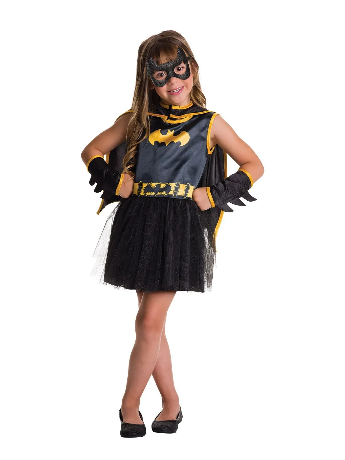 Available Online. For instore availability please call us on 07 3279 1555 One of the most famous DC Comics superheroines, Batgirl, also known as Barbara Gordon is the daughter of Chief Commissioner Gordon. She stars in comics, movies, TV series and also as one of the DC Superhero Girls. A female version of the famous Batman, Batgirl uses her batarangs and bat-cycle to help fight crime and clean up the streets of Gotham City.INCLUDESDress with digitally printed satin bodice showing bat emblem on chest and belt detailsSkirt with nylon underlay and tulle overlaySatin cape with contrast trim and scalloped hemMoulded glitter eyemash with elastic strap plus gauntlets with contrast hems and attached bat finsThis is an officially licensed DC Comics product