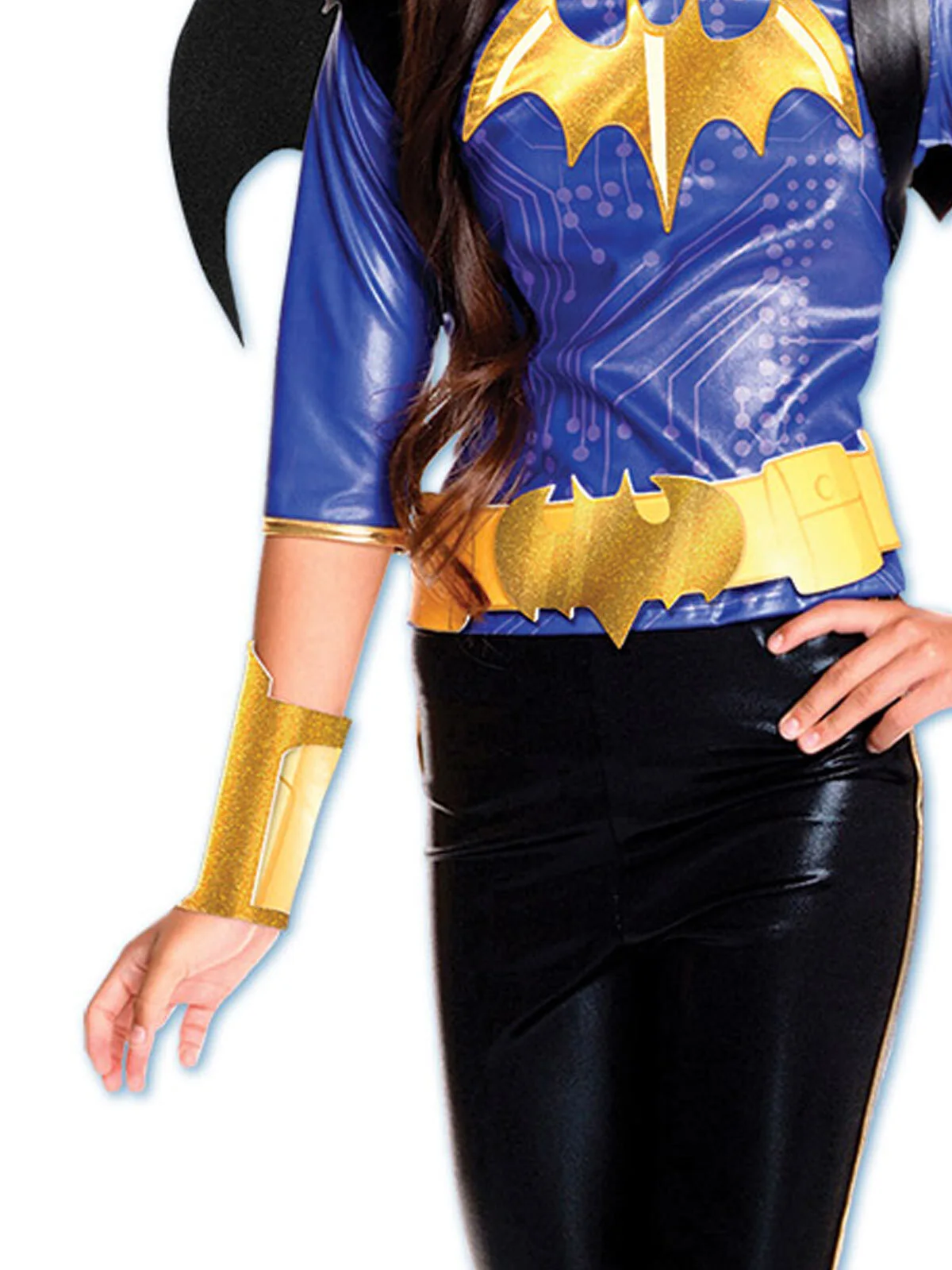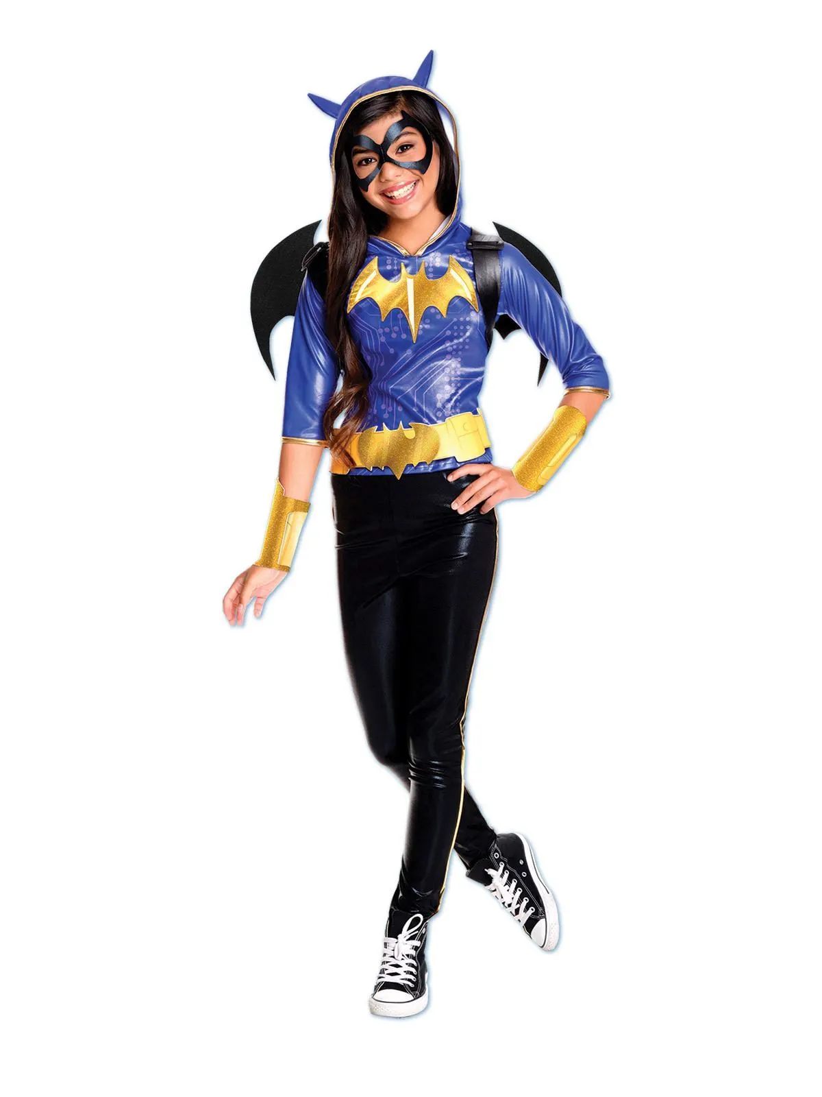 One of the most famous DC Comics superheroines, Batgirl, also known as Barbara Gordon is the daughter of Chief Commissioner Gordon. She stars in comics, movies, TV series and also as one of the DC Superhero Girls. A female version of the famous Batman, Batgirl uses her batarangs and bat-cycle to help fight crime and clean up the streets of Gotham City. INCLUDES Hooded top in shiny fabric with digital print on bodice, attached bat symbol on chest, 3/4 lenth sleeves, ears on hood and gold trim Shiny pants with gold stripe down side Batwings backpack with shaped wings and vinyl look straps Eyemask in vinyl look fabric with elastic strap and vecro fasten, shaped belt with digital print and velcro fasten plus gauntlets with digital print This is an officially licensed DC Comics product