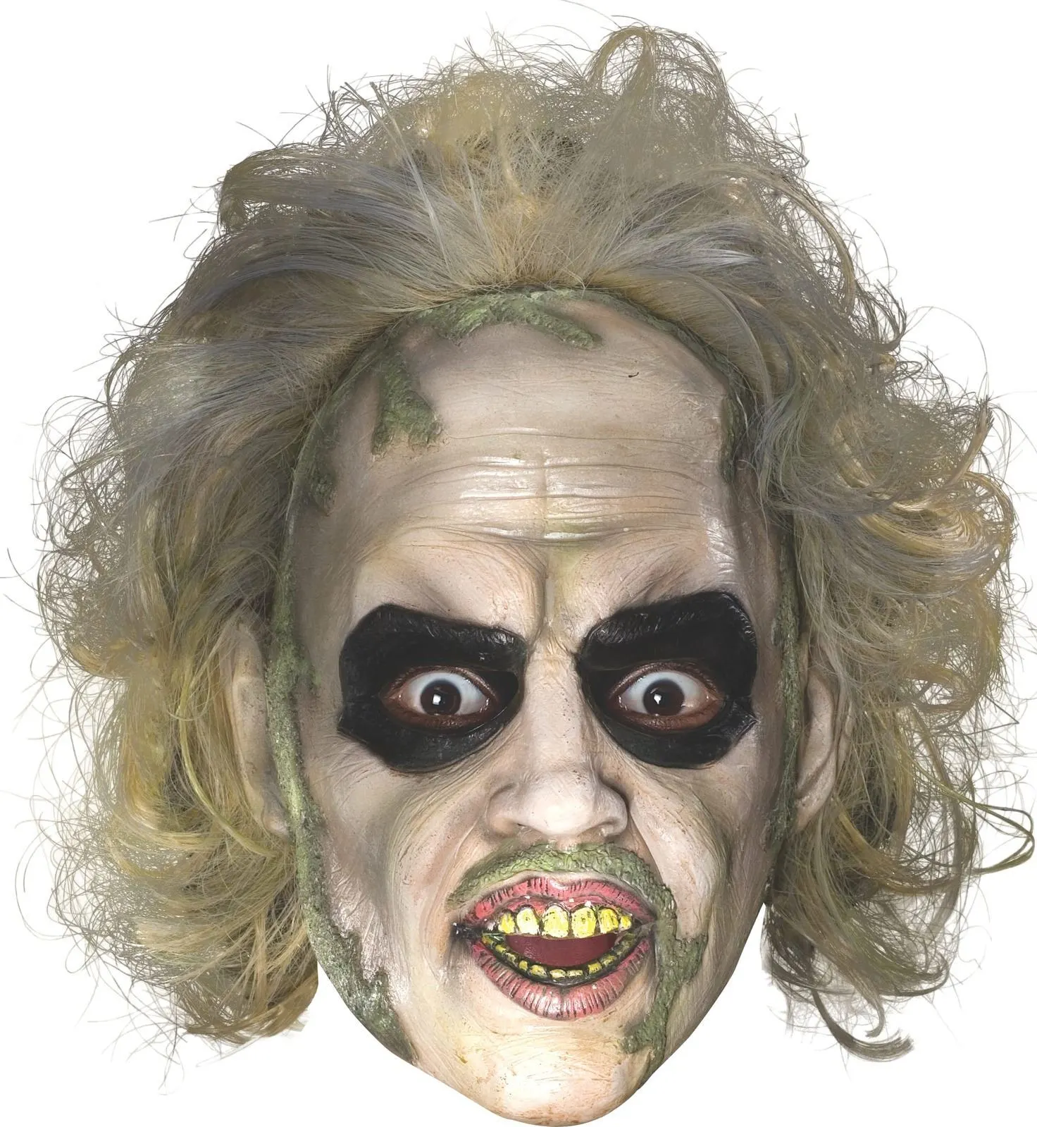 Available Online. For instore availability please call us on 07 3279 1555 Â Beware – if you say Beetlejuice three times he appears! A Tim Burton classic spooky, comedy film from 1988, Beetlejuice makes us jump and jeer at the same time. “Betelgeuse”, played by Michael Keaton tries to ward off the ghosts of Barbara Maitland, (Geena Davis) and Adam Maitland, (Alec Baldwin) from their own home as well as the new residents, an unsuspecting family from New York. A ghost from the Neverland, Beetlejuice haunts, taunts and terrorises in his trademark black and white striped suit with wild grey hair and a painted ghostly face. Try on some magic this Halloween as you “turn on the juice and see what comes loose!”INCLUDESMoulded 3/4 vinyl maskPainted features including black eyes, mouth, teeth and green detailsAttached hair in messy styleHair strand made of polypropyleneThis is an officially licensed Beetlejuice product