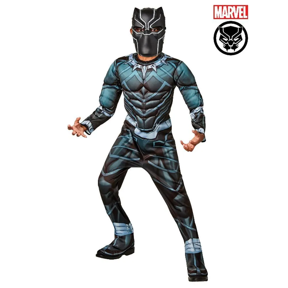 His real name is T’Challa, king and protector of the African nation Wakanda. With his cat-like instincts, Black Panther possesses super-human traits and senses. He is smart, cunning, scientific, and strong, and uses these abilities to combat evil. Originating in the Comics, and more recently played by Chadwick Boseman in the movies of the Marvel Cinematic Universe, Black Panther has clawed his way into that black suit, made out of vibranium, in many blockbuster movies. They include Captain America: Civil War (2016), Avenger’s Infinity War (2018) and most recently in Avengers: Endgame (2019). In his self-titled movie of 2018, Black Panther fights the supervillain Eric Killmonger in a true cat fight! INCLUDES Jumpsuit with digitally printed bodice on front and back, fibre filled muscle chest padding and stitching detail Full length sleeves with digital print and fibre filled muscle detail Pants with digital print on front and back, plus attached 3D boot tops Injection moulded shallow half mask with painted details This is an officially licensed Marvel product