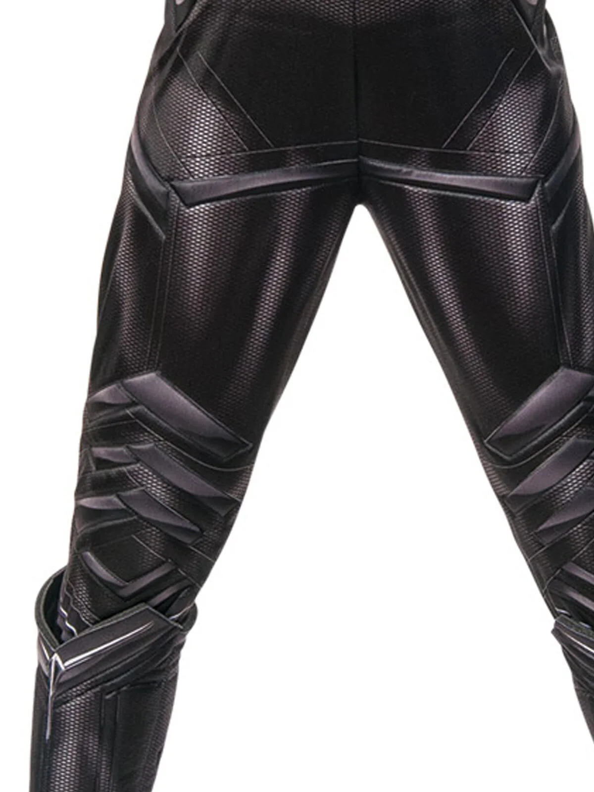 Available Online. For instore availability please call us on 07 3279 1555 His real name is T’Challa, king and protector of the African nation Wakanda. With his cat-like instincts, Black Panther possesses super-human traits and senses. He is smart, cunning, scientific, and strong, and uses these abilities to combat evil. Originating in the Comics, and more recently played by Chadwick Boseman in the movies of the Marvel Cinematic Universe, Black Panther has clawed his way into that black suit, made out of vibranium, in many blockbuster movies. They include Captain America: Civil War (2016), and Avenger’s Infinity War (2018). In his self-titled movie of 2018, Black Panther fights the supervillain Eric Killmonger in a true cat fight!INCLUDESJumpsuit with digitally printed bodice on front and back, fibre filled muscle chest padding and stitching detail plus zip-up back openingFull length sleeves with digital print and fibre filled muscle detail plus attached padded gauntletsPants with digital print on front and back, plus attached padded 3D boot topsVinyl mask with painted detailsThis is an officially licensed Marvel product