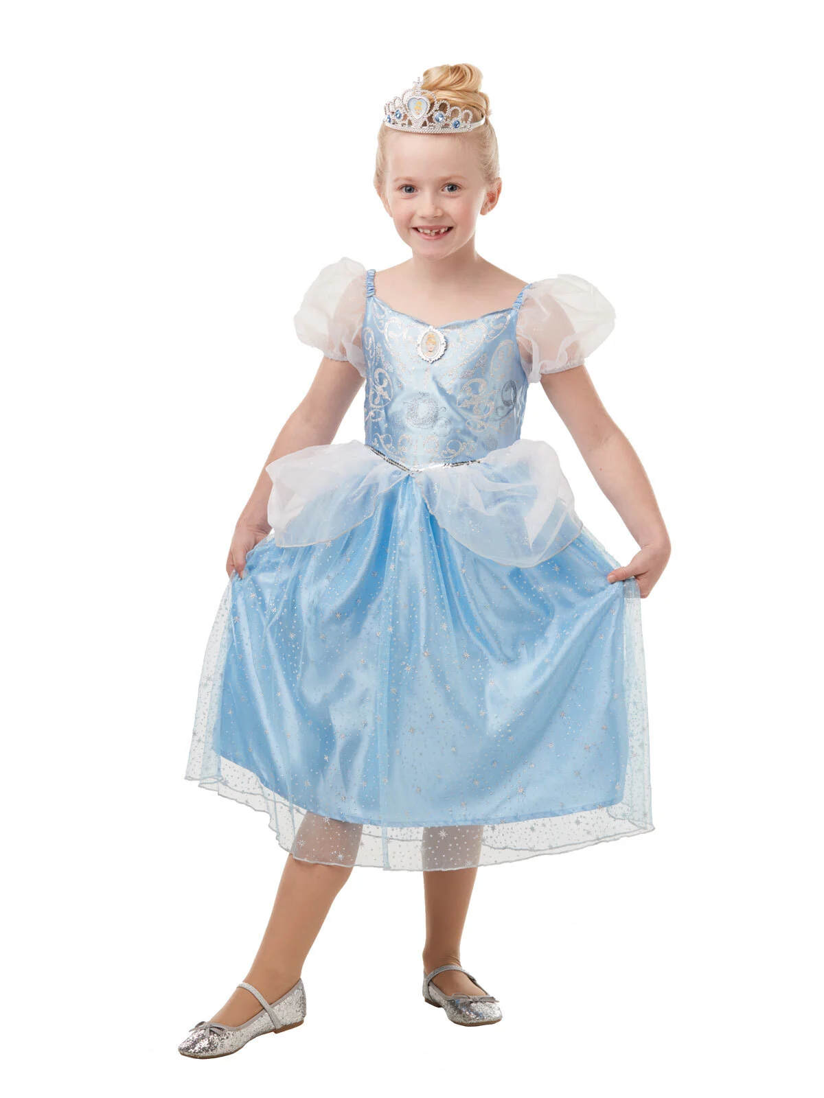 Product Details Bibbidi-Bobbidi-Boo! With a wave of her wand, the Fairy Godmother can help you slide into your Glass Slipper and become one of the most famous Disney Princesses of all time – the beautiful Cinderella in her iconic blue dress – sure to be noticed by Prince Charming himself. Just be sure to stay away from that Evil Step Mother and those nasty Step Sisters. INCLUDES Satin dress with ornate silver and blue bodice featuring character art motif at centre and elastic shoulder straps. Puff sleeves are sheer at shoulders Skirt has silvery glitter print on outer layer and satin below, with silver sequin trim at the waist and features a gathered tulle peplum layer Tiara with faux blue jewels and character art decal sits on a headband Shoes not included This is an officially licensed Disney product