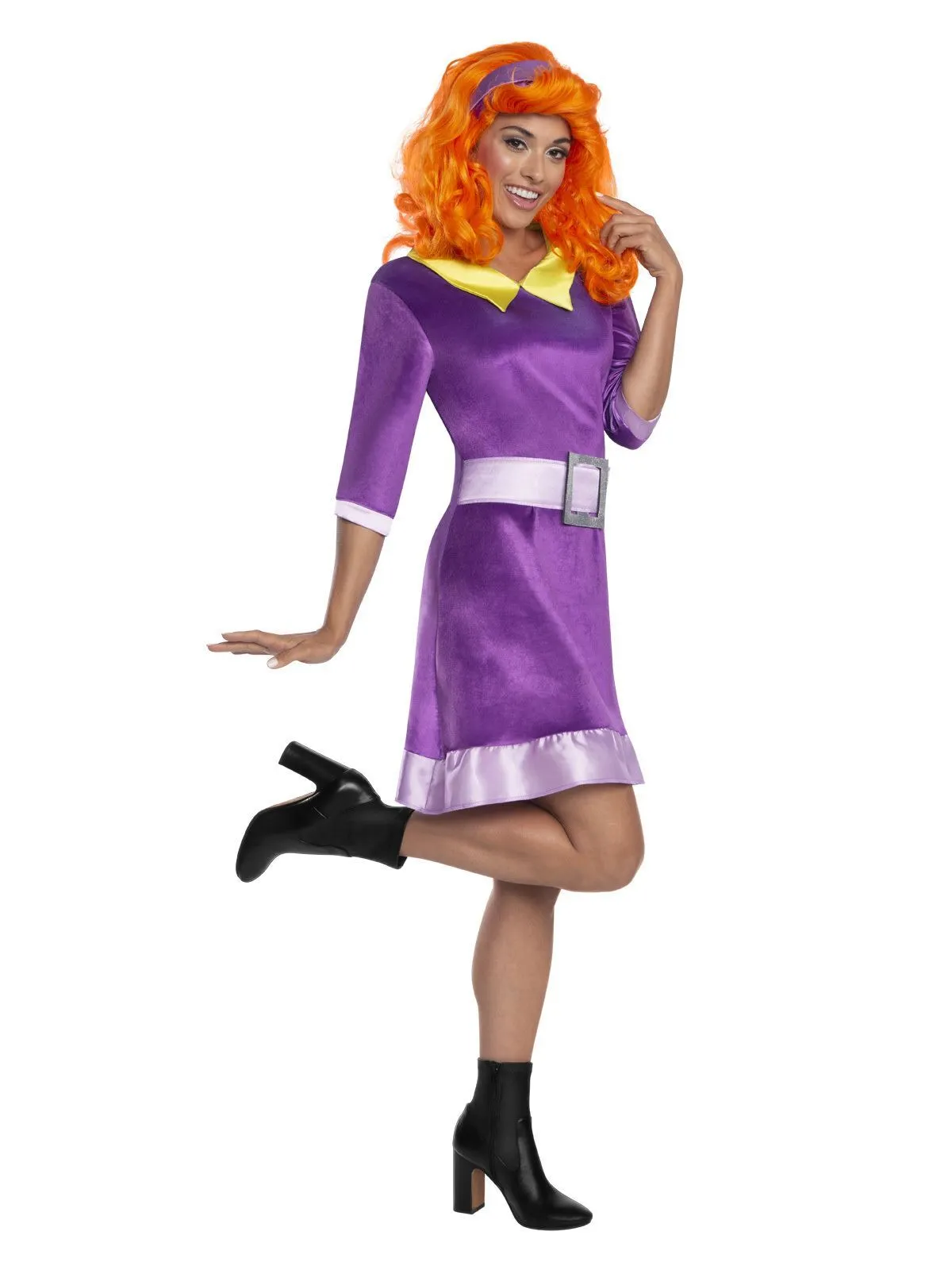 Available Online. For instore availability please call us on 07 3279 1555 “Scooby Doo, where are you?” We all know and love the catchy song from Hanna-Barbera’s animated cartoon series “Scooby-Doo” from 1969, and the subsequent Warner Bros live action movies and TV spin-offs, including the lastest movie Scoob! in 2020. Meet Daphne Blake, the wealthy and beautiful damsel in distress with the nickname “Danger Prone Daphne”. Too busy looking good to do much crime solving sleuth work, Daphne can be more trouble than she is worth with friends Fred, Velma, Scooby and Shaggy. And Scoob! is now available on digital release!INCLUDESPurple shimmery mini dress with mauve satin hem and 3/4 length sleeves with mauve cuffsDress has attached painted belt buckle in glittering silver material on a mauve satin waistband plus a bright yellow satin collarMatching Headband in purpleWig and boots not includedThis is an officially licensed Scooby-Doo product