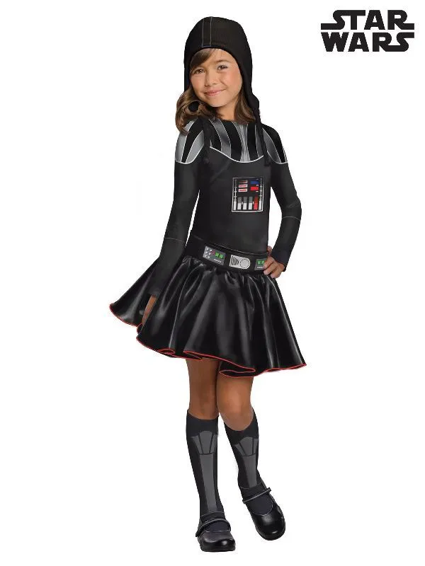 Available Online. For instore availability please call us on 07 3279 1555 Ultimate villain of the original trilogy, Darth Vader was born Anakin Skywalker, a Jedi lured to the dark side by Palpatine. This iconic Lucas Film and Disney anti-hero of the Star Wars series, Darth is father to Luke and Leia and characterised by his black robes, cape, helmet and breathing device. Become the reigning Sith Lord of the Galactic Empire today – and may the force be with you. INCLUDES Dress with printed detail across chest and shoulders, full length sleeves with print on shoulders plus flowing mini skirt with red edging Foam backed belt with printed details and fasten at back Knee high stockings with printed detail on front Headpiece with ear flaps and hanging ties This is an officially licensed Star Wars product