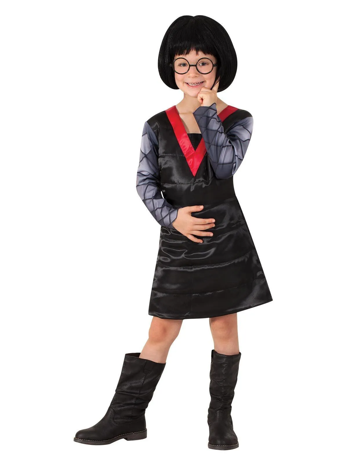 Available Online. For instore availability please call us on 07 3279 1555 “I never look back, darling. It distracts from the now”. She is the tiny pocket rocket fashion designer to the Superhero Parr family “The Incredibles”. Eccentric and highly intelligent, she is known for her black bob haircut and oversized black, round glasses. Edna Mode creates ‘super-powered’ suits for Bob and Helen Parr and children Violet, Dash and even baby Jack-Jack, which enable them to fight crime and save the world one stretch at a time. But remember, “no capes!”, Edna never dresses a superhero in a cape. As seen in Disney Pixar’s The Incredibles (2004) and The Incredibles 2 (2018), become Ms Mode today. INCLUDES Deluxe satin tutu dress, featuring fibre-filled segments with horizontal stitching to create stand out effect plus red satin V neckline Full-length sleeves have digitally printed diamond pattern Black bob wig with polypropylene hair strands and large black plastic-framed glasses with plastic lenses Boots not included This is an officially licensed Disney Pixar product