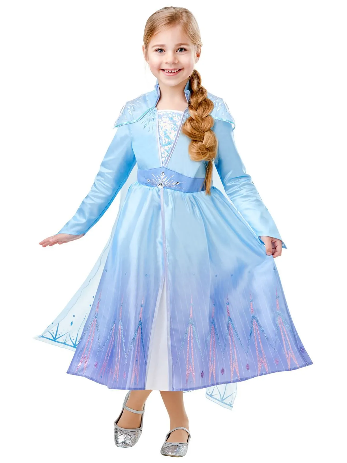 Available Online. For instore availability please call us on 07 3279 1555 “Let It Go!” She is Elsa from the blockbuster Disney movies Frozen (2013), short films Frozen Fever (2015) and Olaf’s Frozen Adventure (2017) and the now NEW movie, Frozen 2 (2019). Featuring actor and singer Idina Menzel, become the magical Queen Elsa as you journey to Arendelle with your sister Anna. With friends Olaf, Kristoff and Sven, together you find the strength and power to reverse the curse that has plunged you and your kingdom into an eternal winter. Take on the guise of Elsa – strong, protective and powerful, and see what adventures await you in Frozen 2. INCLUDES Satinique dress to mid-calf height in shades of blue with mauve highlights and printed mock belt at elasticised waistline, plus iridescent sequin trim design down the full-length sleeves. Sleeves have pointed cuffs Dress features elaborate neckline with a silvery glitter spray panel in the centre plus glitter snowflakes printed on the chest Digitally printed satin skirt displays a textured pattern in mauve and blue shades plus glitter print Detachable digitally printed mirror organza cape features high collar plus a glittery snowflake design throughout. Cape attaches with velcro tabs at the collar of the dress and drapes down to ankle height in two flowing sections Shoes not included This is an officially licensed Disney product