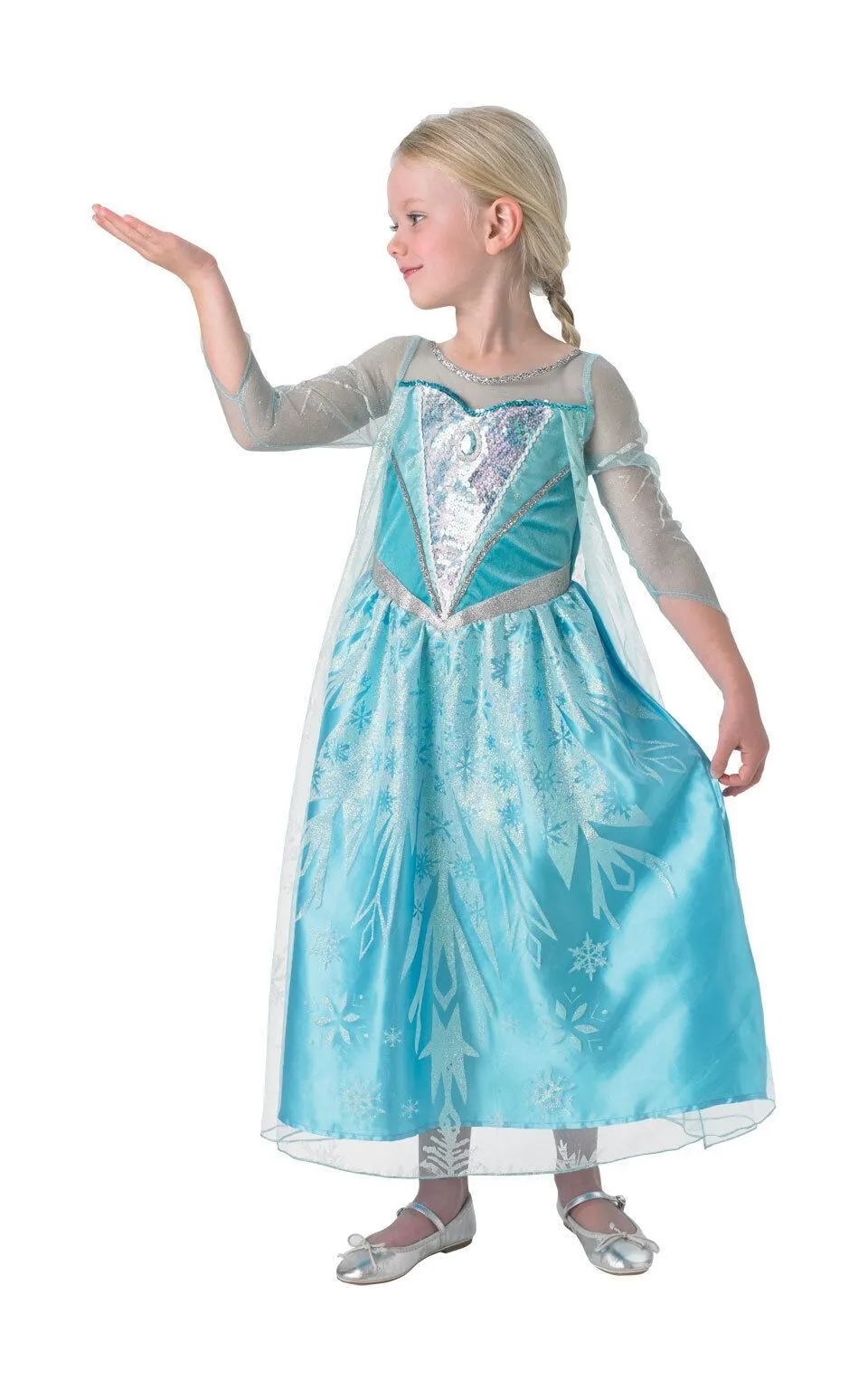 Available Online. For instore availability please call us on 07 3279 1555 “Let It Go!” From the blockbuster Disney movie Frozen (2013) featuring actor and singer Idina Menzel, become magical Queen Elsa as you journey to Arendelle with your sister Anna. Meet new friends Olaf, Kristoff and Sven and together, find the strength and power to reverse the curse that has plunged you and your kingdom into an eternal winter.INCLUDESDress with velour bodice with shimmer fabric and sequin fabric panels, glitter and sequin trimmings, silver glitter attached belt plus tear drop plastic jewel pendantIllusion neckline in tulle with silver glitter trim and 3/4 tulle sleeves with metallic printSatin skirt with glitter printed tulle overlayGlitter printed tulle cape attached front and backThis is an officially licensed Disney product