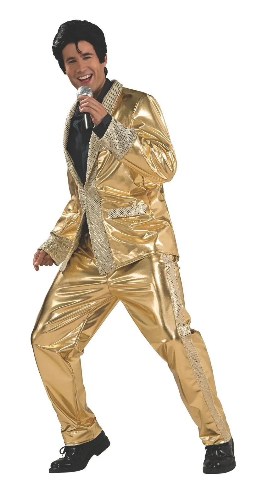 Available Online. For instore availability please call us on 07 3279 1555 For those seeking to rise above, our Collector’s Edition range affords customers the opportunity to do just that. Sure to please the most avid fan and the most discerning eye, the Collector’s Edition presents some of the most iconic characters of all time in the highest quality and detail. Whether for that special occasion or as a standout addition to your collection – our officially licensed costumes are the closest you will get to the real deal, in this case, straight off the Stage as the King of Rock ‘n’ Roll himself. INCLUDES Iconic shiny metallic look gold suit jacket with glitter and sequin embellishments at lapels, collar and pockets Matching gold pants with glittery stripes down both legs and elastic at waist Black shirt and shoes not included Toy microphone sold separately – code 8781 This is an officially licensed Elvis Presley Enterprise product