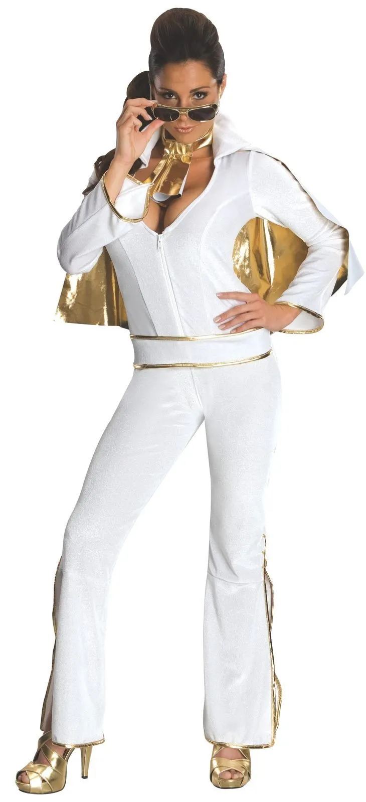 Available Online. For instore availability please call us on 07 3279 1555 A true icon of the 20th century, Elvis Aaron Presley has long been hailed The King of Rock and Roll. Born in 1935 and died in 1977, Elvis was a Song-writer, singer, dancer, actor and swooner. Gospel singer, R&B, pop and rock – he could do it and he had the women in the palm of his hand! Known for his sexy swagger and jumpsuits with jewels, glitz and coloured scarves, Elvis had hundreds of hit songs including ‘Jailhouse Rock’, ‘Love Me tender and ?? Blue Suede Shoes. The best-selling solo artist in the history of recorded music, you’d better start working on your moves, as you slip into a jumpsuit, head to Graceland and transform into the legendary Elvis Presley himself! “Thank you very much!” INCLUDES Iconic white full-body fitted jumpsuit with gold trim and edging, plus a stand-up high collar and front zipper closure. A metallic gold fabric cape is attached to the jumpsuit at the shoulders The belt is foam backed and has velcro at the rear to tighten The neck scarf is matching gold coloured metallic fabric Sunglasses and shoes not included This is an officially licensed Elvis Presley Enterprise product