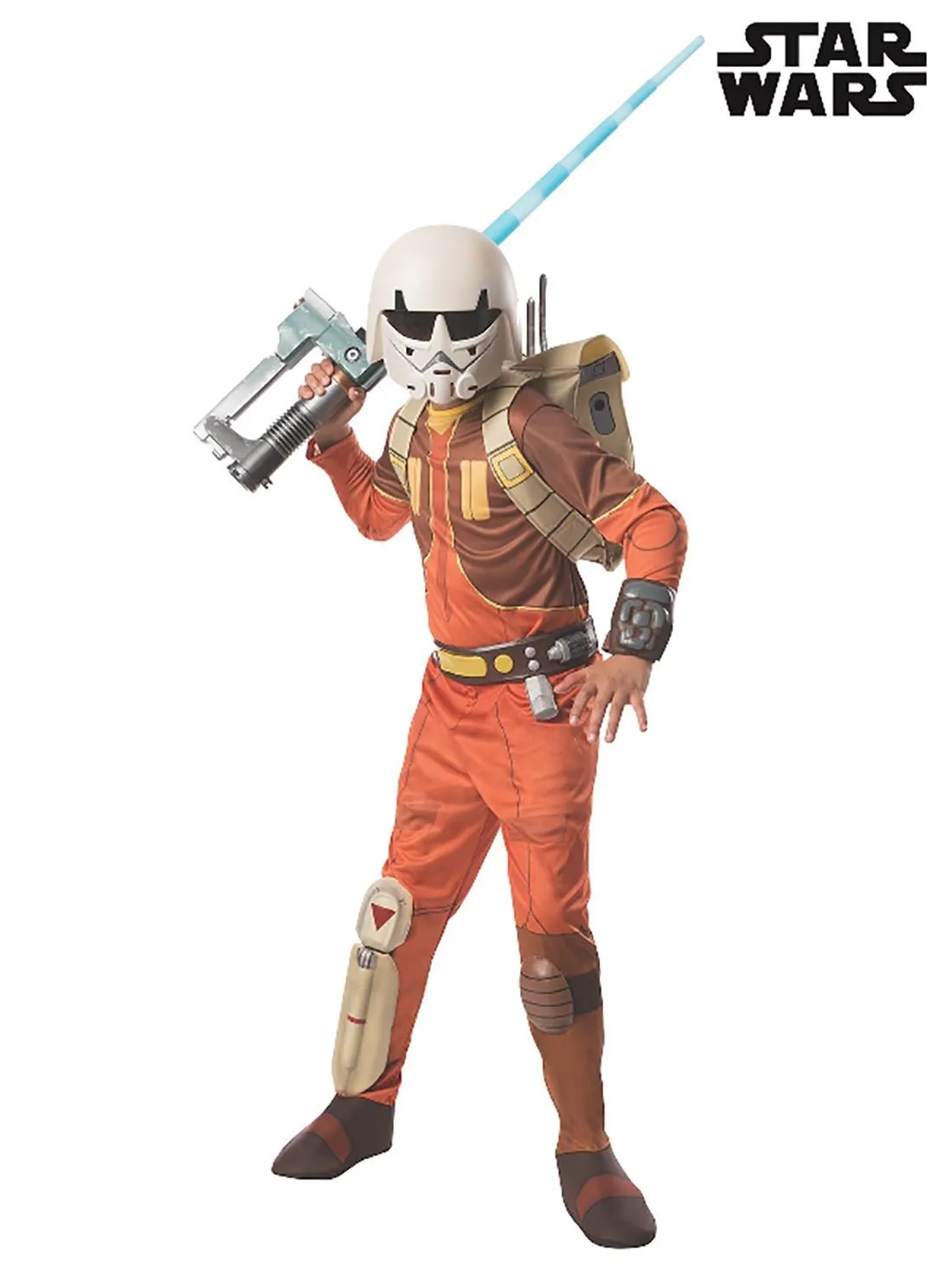 Available Online. For instore availability please call us on 07 3279 1555 Dressed as one of the Star Wars Rebel crew, you’ll forget Ezra was once just a con artist and pickpocket from the planet Lothal. The Force lies within you, so get set to rattle the Imperial enemy under Kanan’s command. INCLUDES Character Printed Deluxe Jumpsuit with attachedShoe Covers and moulded pieces Belt and Backpack Character Mask Lightsabre not included