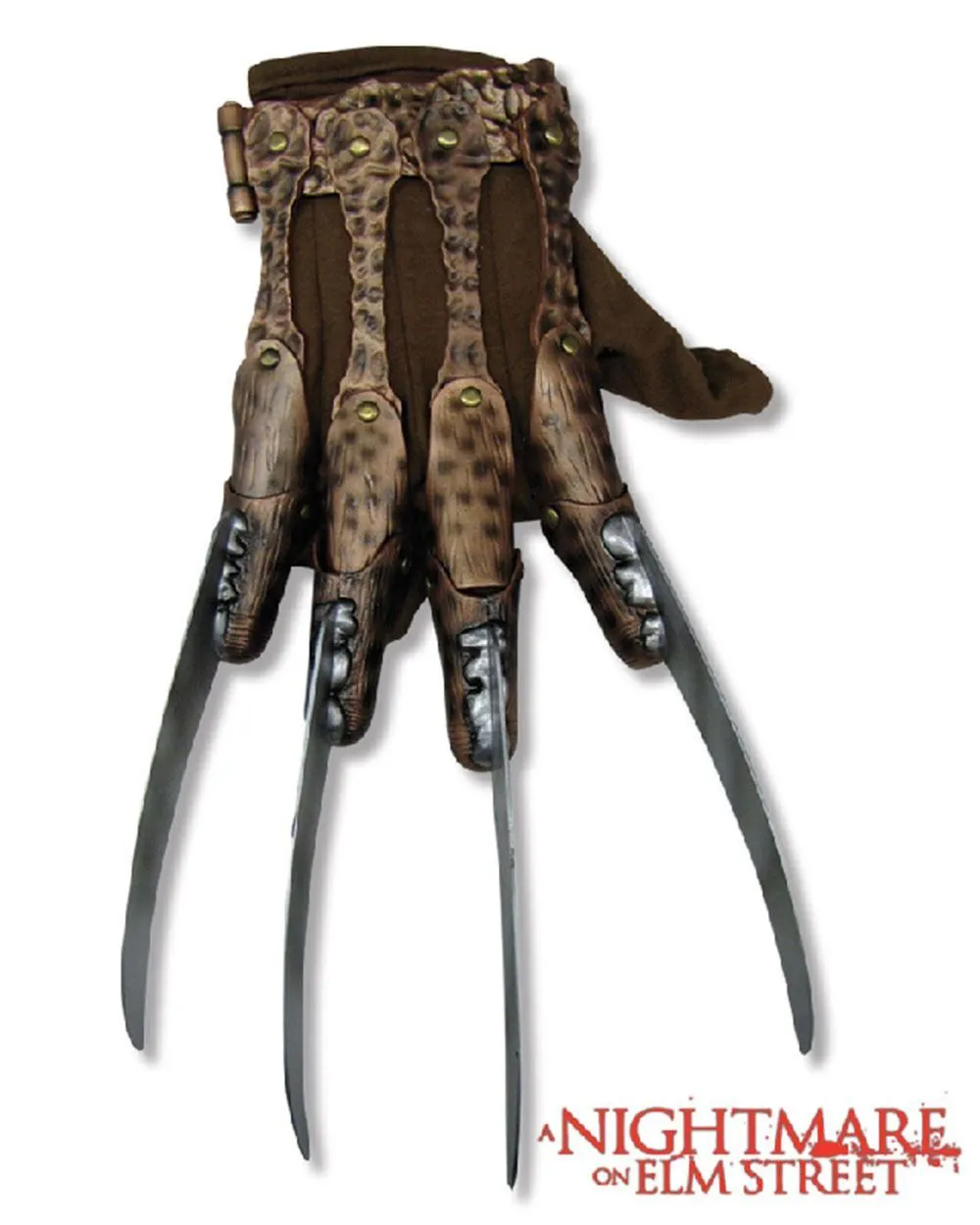 Available Online. For instore availability please call us on 07 3279 1555 “Don’t Go to Sleep!” Defy sleep or risk a visit from Freddy Kreuger himself, protagonist of the 1984 horror movie “A Nightmare on Elm Street”. A severely burnt serial killer, Freddy uses a gloved arm with razors to kill his victims in their dreams, causing their deaths in the real world as well. Appearing in movies, TV series like “Freddy’s Nightmares”, video games and comics, Freddy is known for his disfigured face, red-and-green striped sweater, brown fedora, and that metal-clawed brown leather glove, made for murder. He is a pop culture icon who depicts true Horror. On Halloween, why not try this glove on for size?. INCLUDES A pair of soft synthetic gloves with attached plastic blades Moulded plastic with blunted ends and painted features Adjustable strap at wrist Approximately 3cms high and 8cms wide This is an officially licensed A Nightmare on Elm Street product