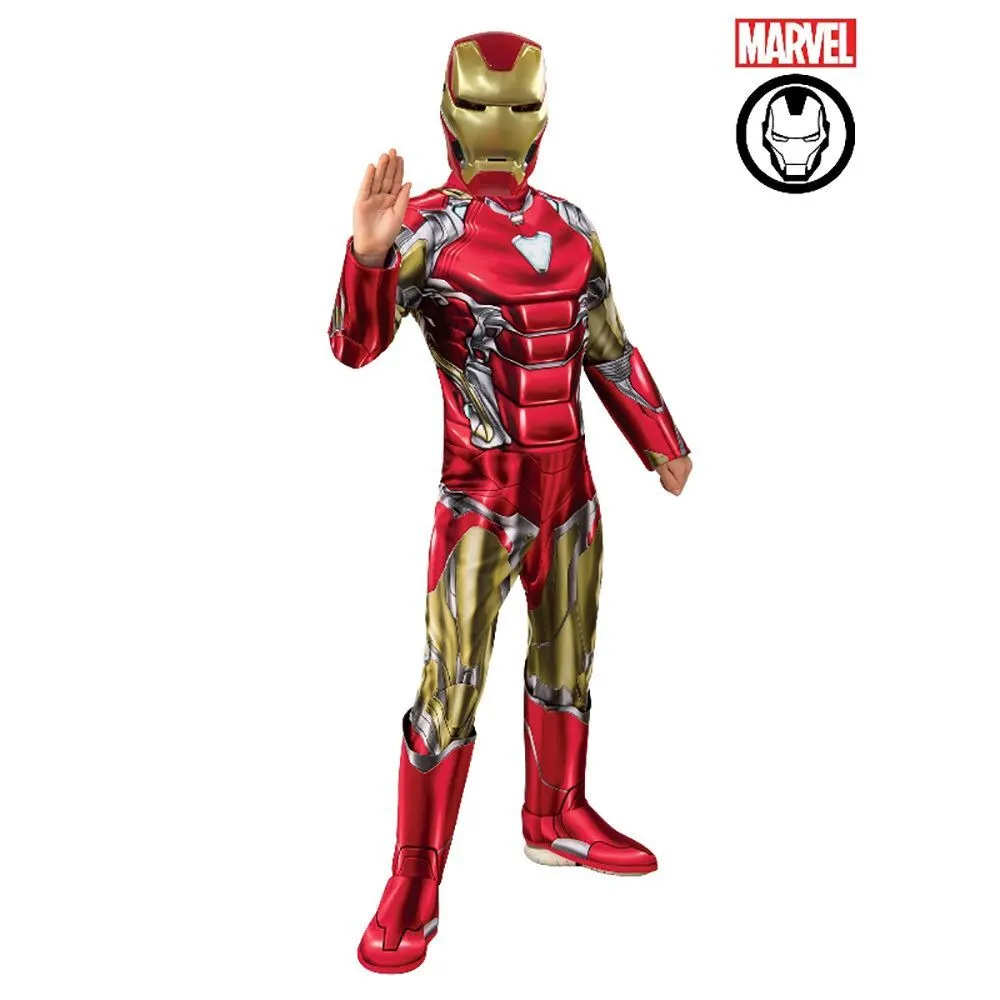 Product Description One of the ultimate superheroes from the Marvel Comics and Disney’s Marvel Cinematic Universe, Iron-Man, alias Tony Stark (played by actor Robert Downey Jr) is the leader of the Avengers. As seen in movies Iron-Man (2008), Iron-Man 2 (2010), The Avengers (2012), Iron-Man 3 (2013), Avengers: Age of Ultron (2015), Captain America: Civil War (2016), Spider-Man: Homecoming (2017), Avengers: Infinity War (2018) and in his grand finale, in Avengers: Endgame (2019), he is known for his arc reactor and metallic armour suit in crimson and gold. His suit gives him super powers and was designed by the intelligent Engineer, Tony Stark. INCLUDES Deluxe Jumpsuit with digitally printed bodice, fibre filled chest armour and stitching detail Full length sleeves with digital print, fibre filled armour and stitching detail Pants have digital print on front and back plus attached 3D boot tops with elastic to secure under shoe Moulded full face mask with painted features and elastic band with velcro fasten plus eye holes to see through This is an officially licensed Marvel product