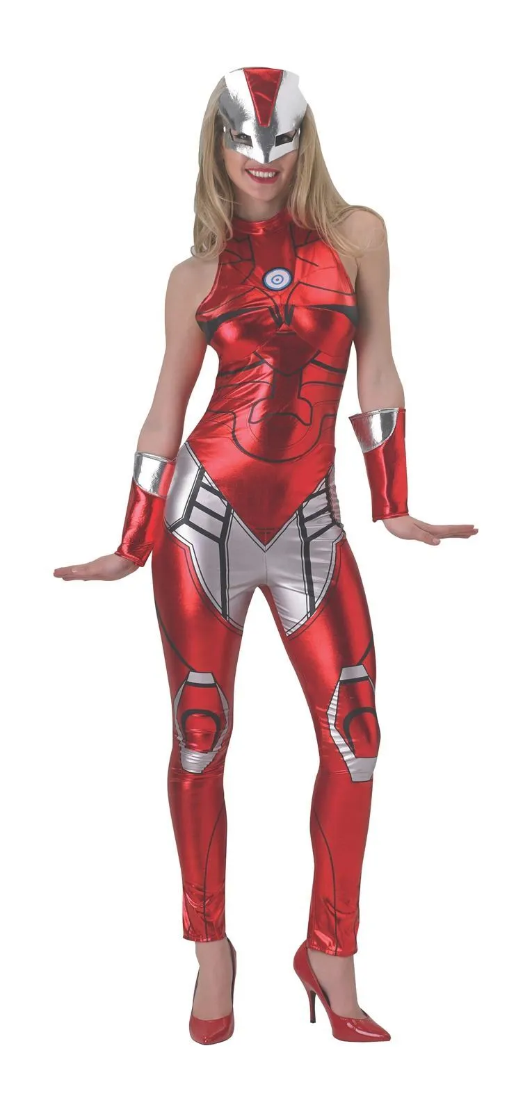 Available Online. For instore availability please call us on 07 3279 1555 Pepper Potts is the female Iron-Man in Marvel Comics and featuring in the Marvel Cinematic Universe. In 2009, she assumed the identity of Rescue after being given her own suit of armour, not dissimilar to Tony Stark’s, her love interest. Rescue wears the iconic red and gold of Iron-Man and hold her own in Marvel combats.INCLUDESJumpsuit in metallic fabric with armour print and halter neck necklineGauntlets in metallic fabric with panelled colourEyemask in foam backed metallic fabric with panelled colours and elastic bandThis is an officially licensed Marvel product