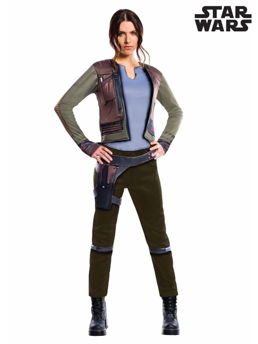 Available Online. For instore availability please call us on 07 3279 1555 She is a female human, soldier and member of the Alliance. A former criminal, Jyn Erso steals the plans of the Death star in Star Wars: Rogue One. Played by actor Felicity Jones, why not don the jacket and the attitude of Jyn today! INCLUDES Jacket with digital print and foam padding plus attached shirt front Full length sleeves with digital print and thumb holes Pants with strap detail Belt with attached holster, digital print and fastens at waist and leg with velcro. Boots not included This is an officially licensed Star Wars product
