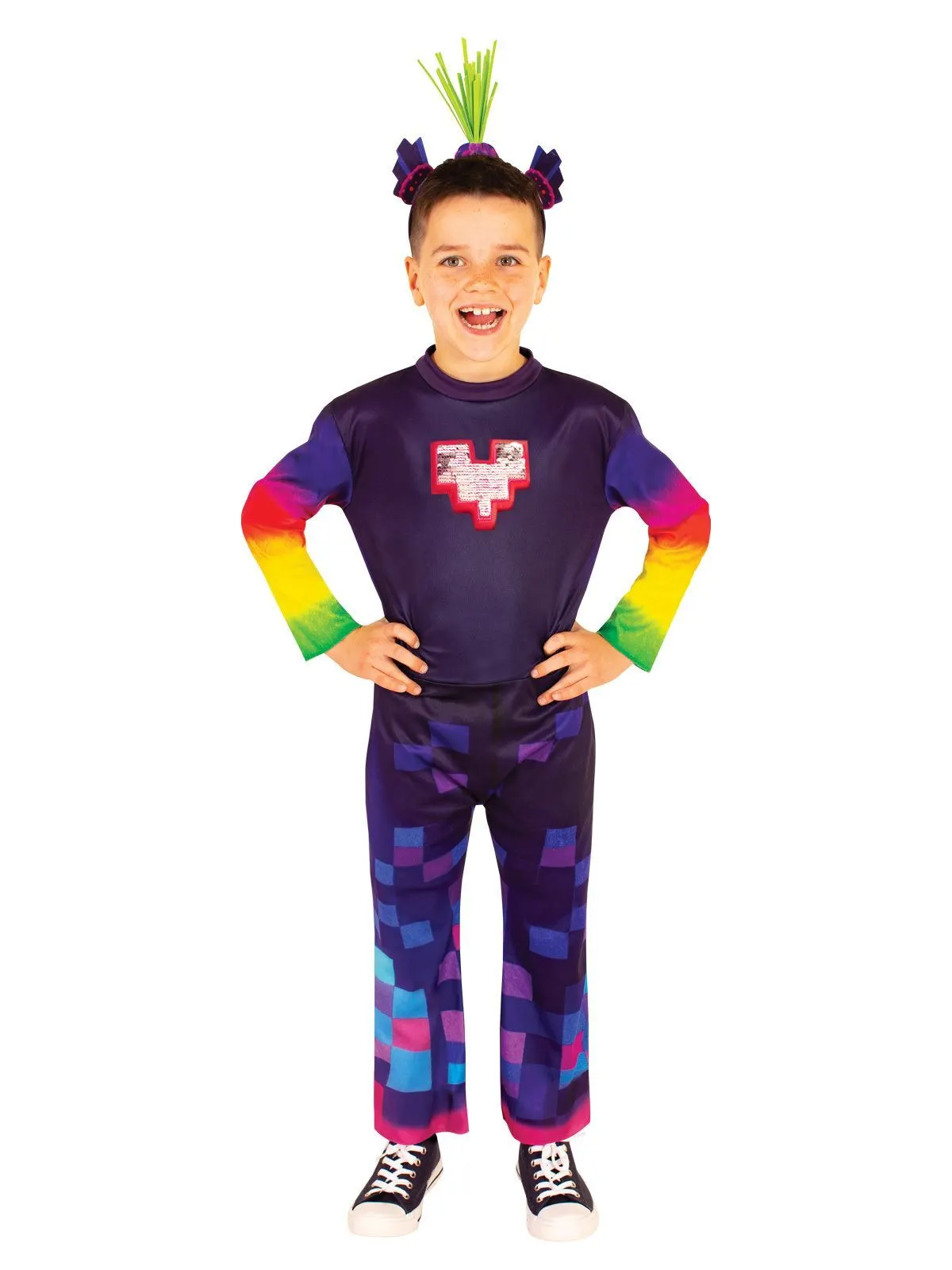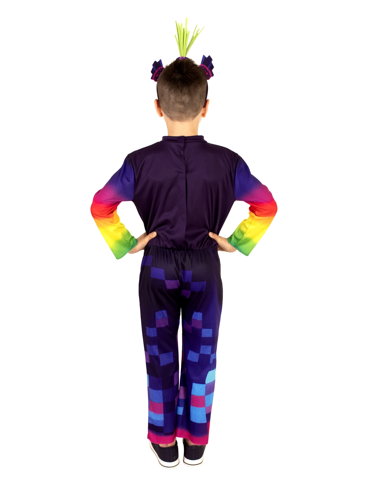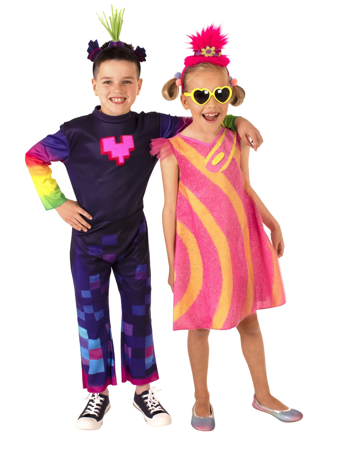 Available Online. For instore availability please call us on 07 3279 1555 Time to troll up and join the world tour with Universal’s Trolls 2. Featuring in Trolls World Tour (2020), King Trollex is the King of The Techno Trolls, an aquatic subspecies and race of trolls. As the only one of six Troll Kingdoms that lives in water, The Techno Trolls are a unique, vibrant and colourful tribe. Known for the Electric, Techno style of music, their way of life and music is threatened by Queen Barb, King Thrash and the Rock Tribe who plan to destroy all of the other musical tribes and steal all six strings. Join King Trollex on his journey to save his colourful, electric tribe and the Techno Kingdom! INCLUDES All in one colourful long-sleeved jumpsuit in polyester with digitally printed rainbow colours on the sleeves and legs Jumpsuit features a pink heart on the chest with a sequin colour change panel, which changes from silver to pink with a brush of the hand Jumpsuit closes with three velcro tabs at the rear The headpiece is a headband with attached felt hair pieces in upright shape and felt printed detailing Shoes not included This is an officially licensed Trolls 2 product