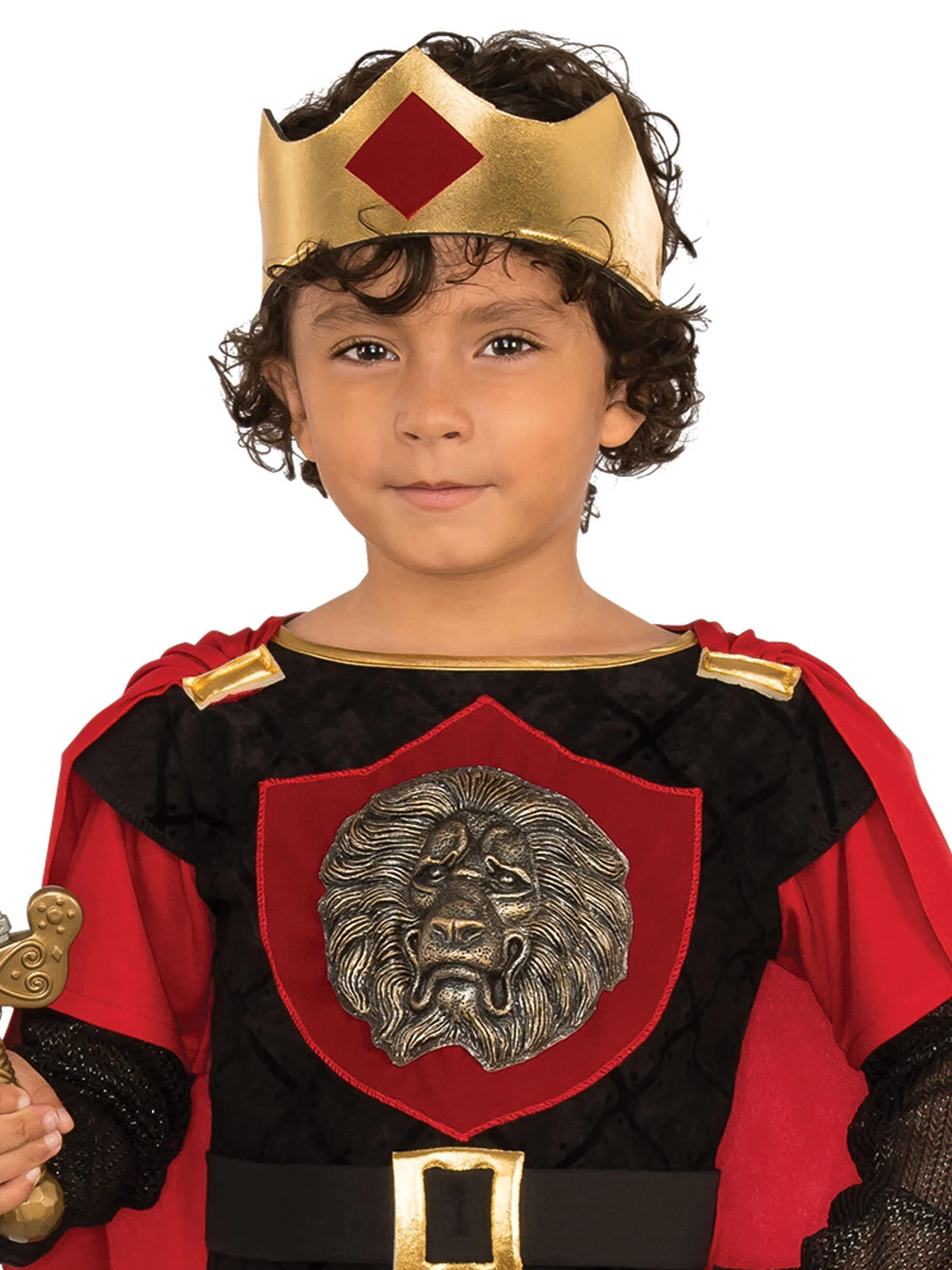 Available Online. For instore availability please call us on 07 3279 1555 Don your shining armour! Wield your sword! This gallant and cavalier Warrior of medieval times feared nothing but the elusive Dragon.INCLUDESTop with printed pattern, shield emblem sewn on chest with plastic lion head, belt with mock gold buckleSleeve length in woven fabric to give chain mail look, upper sleeve in polyesterDetachable cape with gold fastenersFoam backed crown with diamond print at center