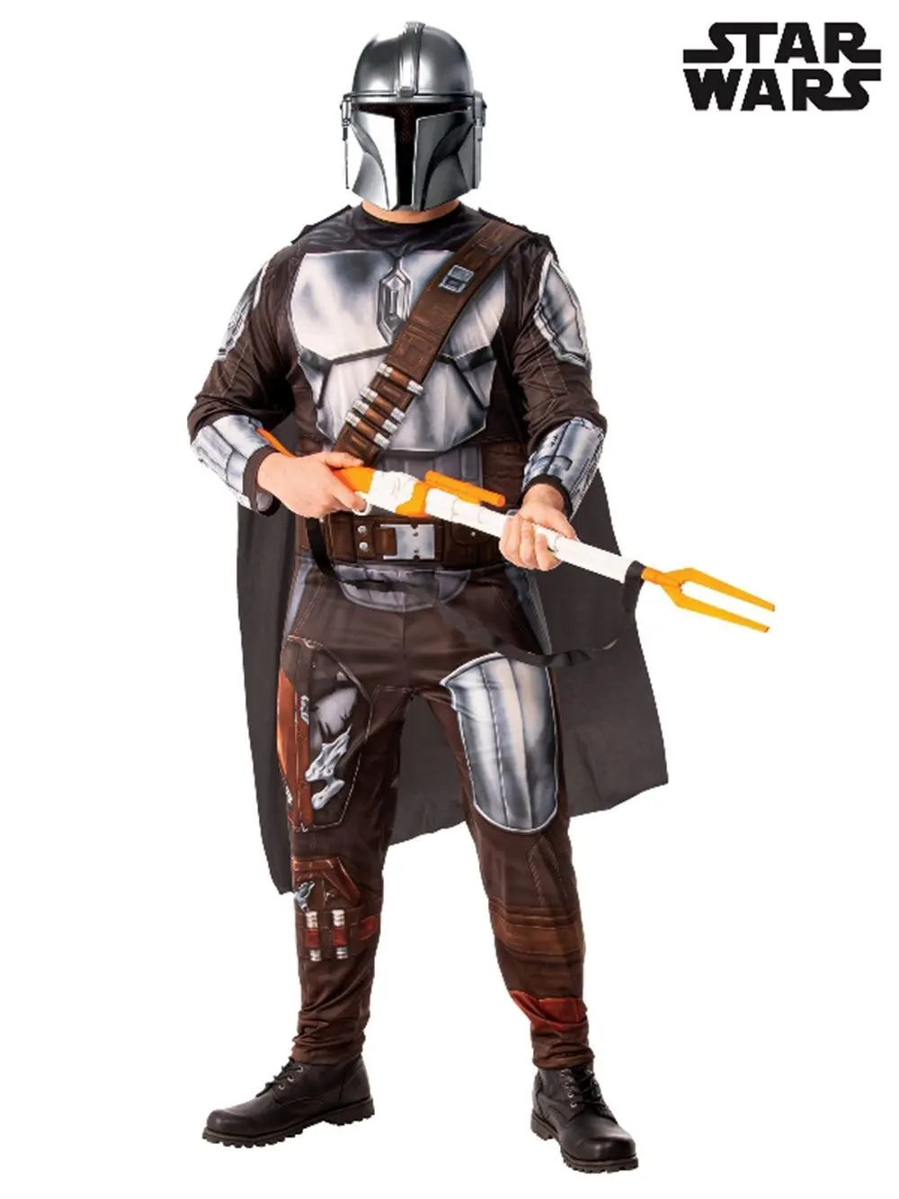 Available Online. For instore availability please call us on 07 3279 1555 Set five years after the events of Return of the Jedi and 25 years prior to the events of The Force Awakens, Disney+ released Star Wars: The Mandalorian as a live action TV series in 2019. The story follows the title character, the Mandalorian bounty hunter Din Djarin, and his exploits beyond the reaches of the New Republic. Taking the world by storm, actor Pedro Pascal, also referred to as “Mando” was a foundling rescued by Mandalorians. “The Child” is a toddler at age 50 and is of the same unnamed species at powerful Jedi Master Yoda and needs to be delivered to “The Client” by the Mandalorian. INCLUDES Digitally printed deluxe jumpsuit with printing on front and back and foam padded body armour Jumpsuit features a holographic panel on the chest Moulded 3D belt is digitally printed and attached to the moulded and painted 3D bandolier Long grey cape attaches with velcro tabs at shoulders Moulded EVA plastic 1/2 face mask has an elastic strap at rear plus tight knit mesh to see through Blaster and shoes not included This is an officially licensed Star Wars product