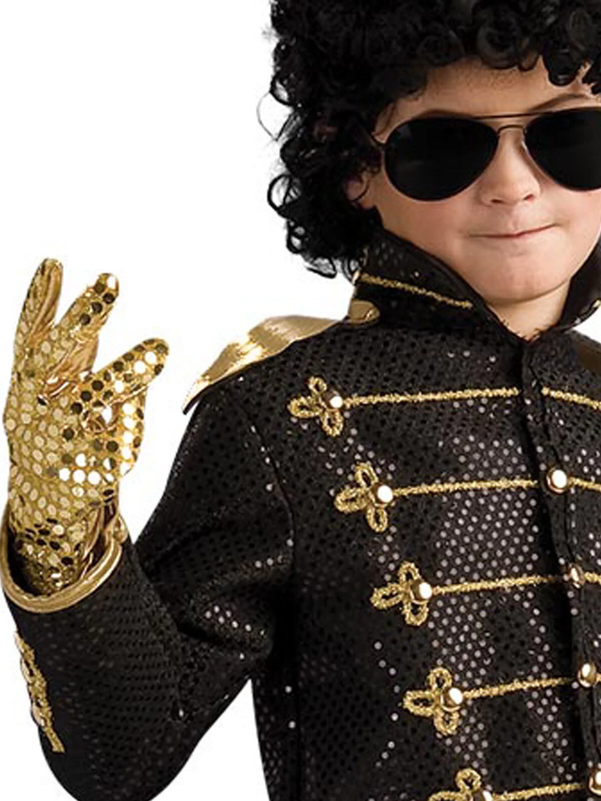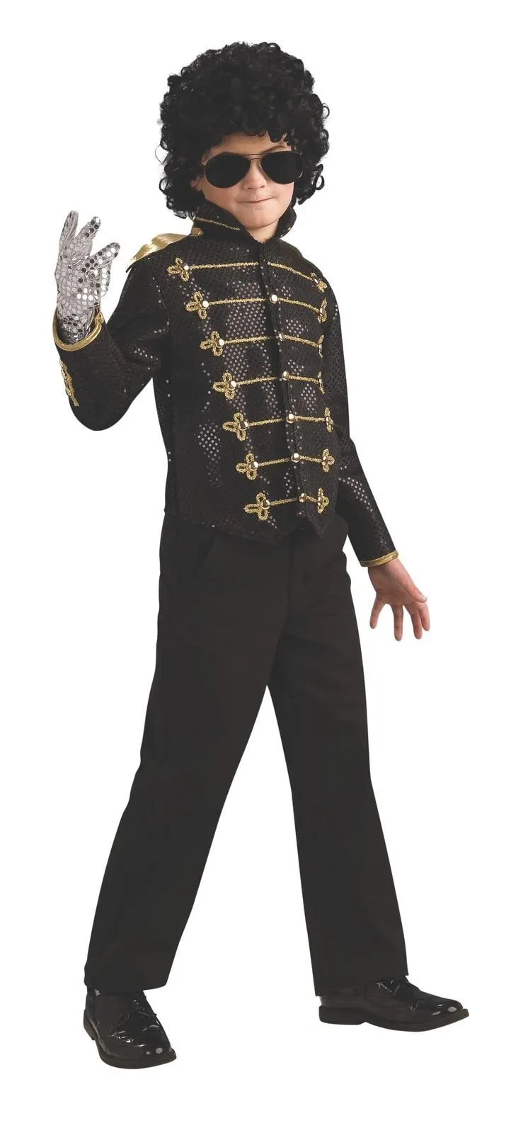 Available Online. For instore availability please call us on 07 3279 1555 A Pop icon of the 20th century, Michael Jackson has long been hailed The King of Pop. Born in 1958, Jackson was part of the famous Jackson Five siblings and went on to sell over 350 million records worldwide. Song-writer, singer, dancer, theatrics, he could do it all. Known for his moonwalk and wearing one white glove, Jackson had hundreds of hit songs including ‘Beat It’, ‘Billie Jean’ and ‘Thriller’. He is also a two-time member of the rock and roll hall of fame. So better start working on your moves, as you transform into the legendary Michael Jackson himself! INCLUDES Deluxe vinyl, shiny black trademark military jacket with front studded closure The jacket has military look sewn on stripes and buttons on the torso and sleeves plus gold fabric attached to the shoulder piece High collar Full costume with wig, pants and glove sold separately. Shoes not included This is an officially licensed Michael Jackson product