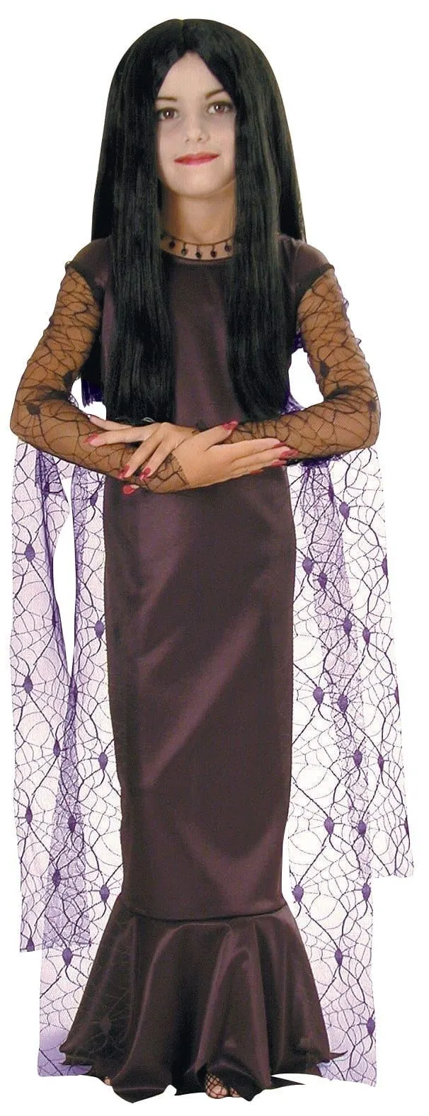 Available Online. For instore availability please call us on 07 3279 1555 No-one wears a long black dress, long black nails and long black hair quite as well as the glamorous, but ghostly Morticia Addams, the matriarch of the Addam’s family. Played by Angelica Houston in the modern movies “The Addams Family” (1990) and “The Addams Family Values” (1992), this character is a household name and is easily recognised for her calm yet crazy ways. She is also the macabre mother to Wednesday and Pugsley. To become Morticia, you will have to brush up on the romantic language French, in order to entice your husband Gomez. She’s creepy and she’s kooky – but ideal for Halloween. Look horrifically good as Morticia Addams. INCLUDES Full-length dress in satin with mermaid skirt Full-length lace sleeves with a satin cap at top and spiderweb look to lace Spider web look lace panels draping from sleeves Wig sold separately This is an officially licensed The Addams Family product