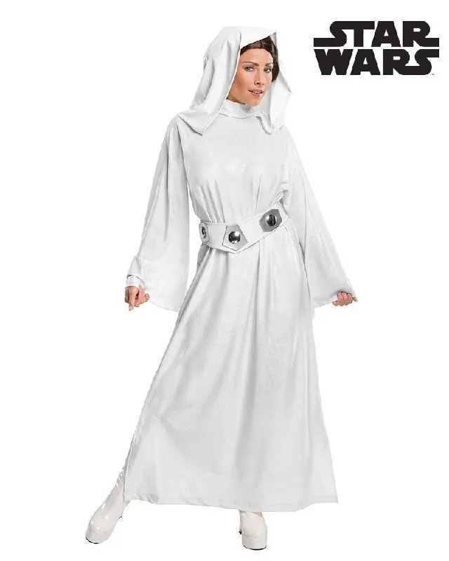 Available Online. For instore availability please call us on 07 3279 1555 Become the Rebel Alliance’s Greatest Leader. Fearless and strong, she, along with friends like Han Solo and brother Luke Skywalker bring down the Death Star in the famous Lucas Film and Disney Star Wars series. Played by the iconic Carrie Fisher, Princess Leia Organa appears in Star Wars: A New Hope (1977), The Empire Strikes Back (1980), Return of the Jedi (1983), Revenge of the Sith (2005), The Clone Wars (2008), Star Wars: Rebels (2014), The Force Awakens (2015), Rogue One (2016) and The last Jedi (2017). She is known for her trademark long white dress and immaculate plaited hair buns. This woman is a heroine of all the Galaxies as she fights like a Jedi with her lightsaber. Dressed as Princess Leia, you know the force will always be with you. INCLUDES Long white hooded dress in polyester with stand away collar and full length trumpet sleeves Moulded belt with painted features and tie at back Wig with brown strand and buns styling. Hair strand made of polypropylene, fabric content polyester White boots not included This is an officially licensed Star Wars product