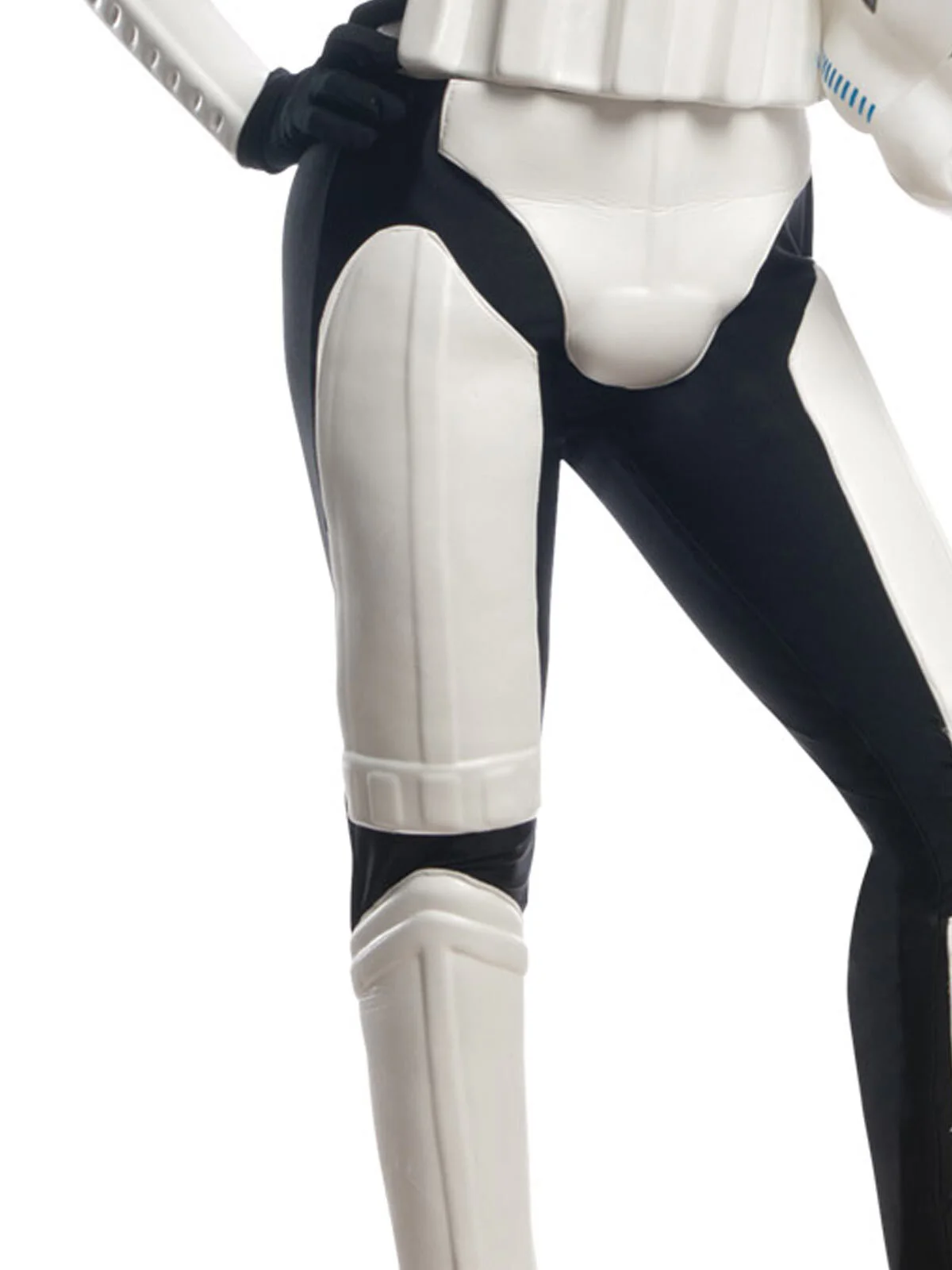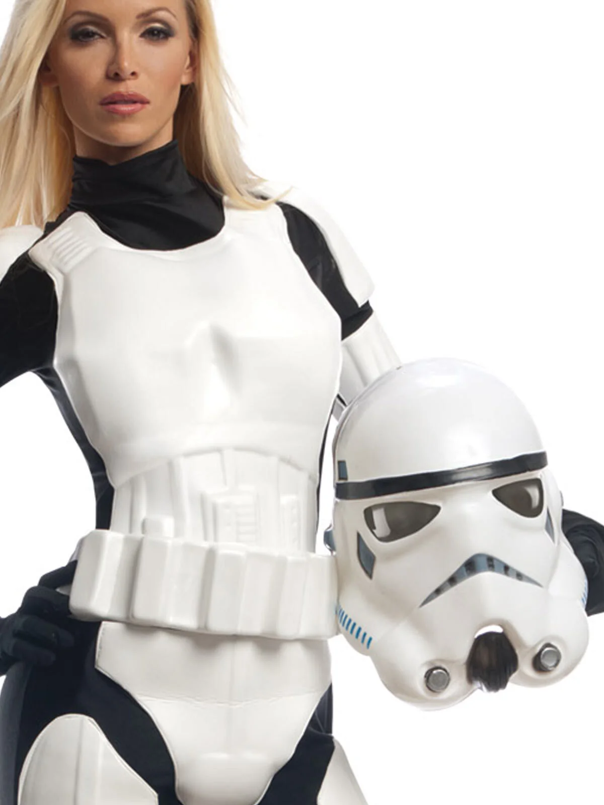 Available Online. For instore availability please call us on 07 3279 1555 The White Army of the First Order, the Stormtroopers are the ground force of the galactic empire. They march in their white armour, fight with lightsabers and show no fear. Seen in almost all the Star Wars movies by Disney and Lucas Film, the Stormtrooper is a very cool choice for Halloween or dress up parties. INCLUDES PLEASE NOTE – THIS COSTUME HAS BEEN REDUCED IN PRICE BY 20% DUE TO A SLIGHT DYE TRANSFER FROM THE BLACK TO THE WHITE. PLEASE BE AWARE THERE ARE NO REFUNDS OR RETURNS ON THIS ITEM Black jumpsuit with full length sleeves and stand away collar Attached moulded foam armour pieces including chest, shoulders, arms, and legs Moulded belt with fasten at back Moulded 2 piece mask with transparent eye covers and velcro attachments This is an officially licensed Star Wars product