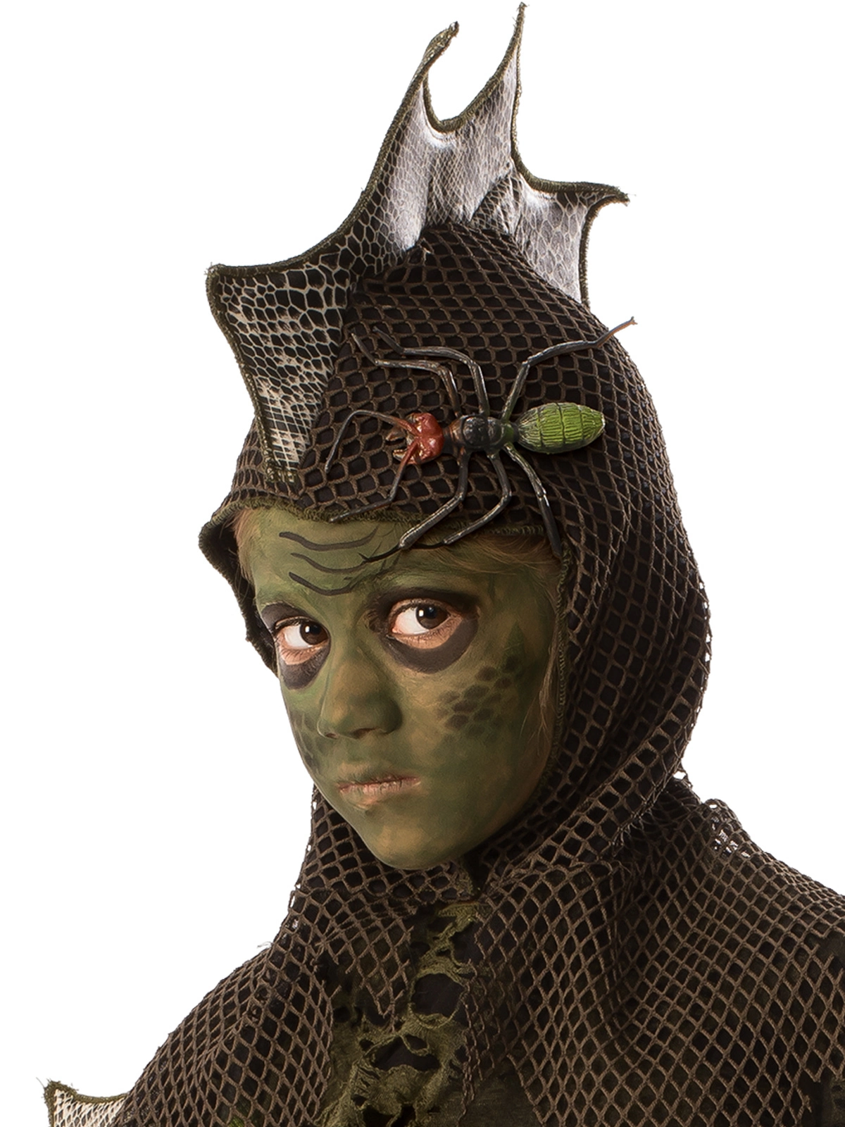 Available Online. For instore availability please call us on 07 3279 1555 Become a green, slimy mutant this Halloween. Swamp boy is half lizard, half boy, full scary! Perfect for lazing about on a rock, warming up your cold-blood!INCLUDESTop with stylised holes and black underlay plus attached novelty snakeFull length sleeves with stylised holes and black underlay, plus shaped frill embellishments with printed detailHood in netted fabric with shaped and printed crest over the top plus novelty spider attachedPants not included