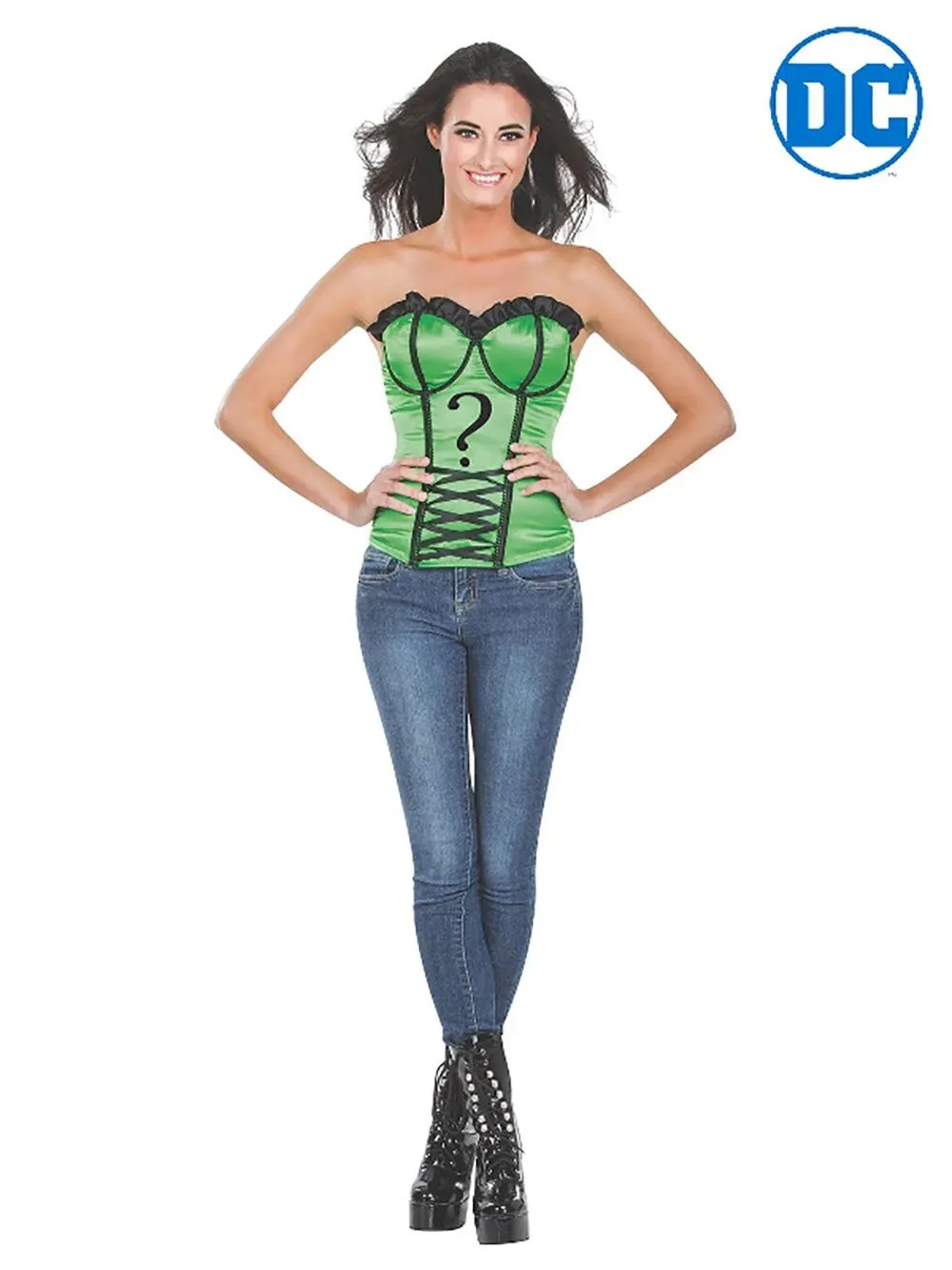 Available Online. For instore availability please call us on 07 3279 1555 Not so funny, and always puzzling, The Riddler, Edward Nigma, is known for his green suit with question marks and a walking cane. Always making up word games and quizzes to confuse The Batman and Commissioner Gordon , Riddler is a DC Comics supervillain, set to destroy Gotham City and have the last laugh. Seen in Warner Bros movies “Batman: The Brave and Bold” (2008), “Batman Forever” (1992) and “Batman” (1992), The Ridder has also been Batman’s arch-nemesis in TV series from the 1960’s and video games. Solve a puzzle today and become The Riddler. INCLUDES Corset in satin with black contrast boning Bustier with contrast trim, in a sweetheart neckline and with a black satin frill across the top Middle panel with question mark print and crossover ribbons This is an officially licensed DC Comics product