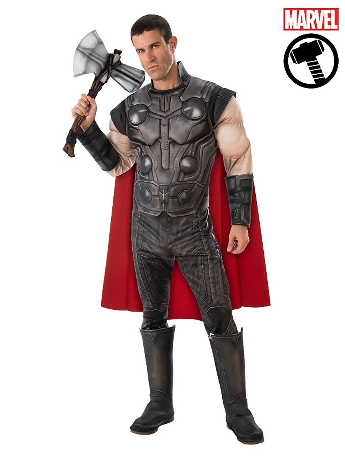 Available Online. For instore availability please call us on 07 3279 1555 Â He is Marvel’s Nordic God of Thunder and brother to the evil Loki. Thor is known for his super-human strength and trusty hammer, the Mjolnir as well as his new weapon of choice – the axe, Stormbreaker. Played by Australian actor Chris Hemsworth, Thor has starred with his Avenger Hero friends in many blockbuster movies in Marvel’s Cinematic Universe. From The Dark World (2013) to Age of Ultron (2015), Ragnarok (2017), Infinity War (2018) and most recently, Avengers: Endgame (2019) Thor is a true Marvel Superhero. INCLUDES Top with a digitally printed fibre-filled bodice with stitching details plus full-length sleeves with fibre-filled muscles and attached 3D gauntlets Pants are digitally printed with attached 3D boot tops Digitally printed belt with velcro fasten Red fabric cape to knee height with velcro tabs at rear. Weapon sold separately This is an officially licensed Marvel product