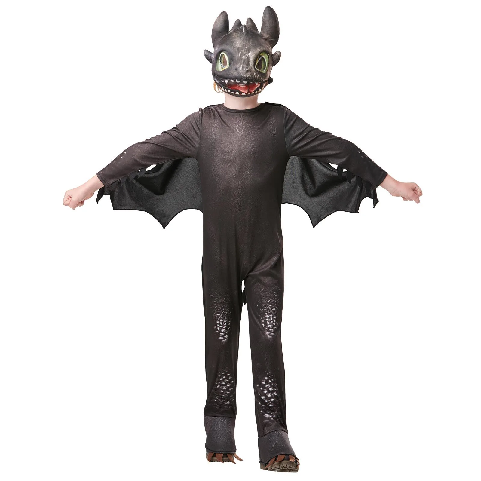 Available Online. For instore availability please call us on 07 3279 1555 Â Toothless is the Night Fury dragon, befriended by Hiccup in the Dreamworks Animation/Universal Film’s “How to train your dragon” (2010), “How to train your dragon: 2” (2014) and the newest movie “How to train your dragon 3: The Hidden World” (2019). A strike class dragon, Night Fury dragons attack at night and are a most feared and mysterious species. They can dive bomb their prey, shoot plasma blasts from their mouths and have retractable teeth. Loyal to Hiccup and friends with Astrid, become Toothless today!INCLUDESFull length black printed Jumpsuit with long sleeves and attached boot topsWide span, black cape wings with three detachable velcro points to adhere to the arms of the jumpsuitFelt tail with red insert and skull graphic, attached to the base of the wings capeMoulded plastic EVA mask with painted details, mesh eye holes and mouth hole. Mask has an elastic strap and velcro fastenThis is an officially licensed How To Train Your Dragon product