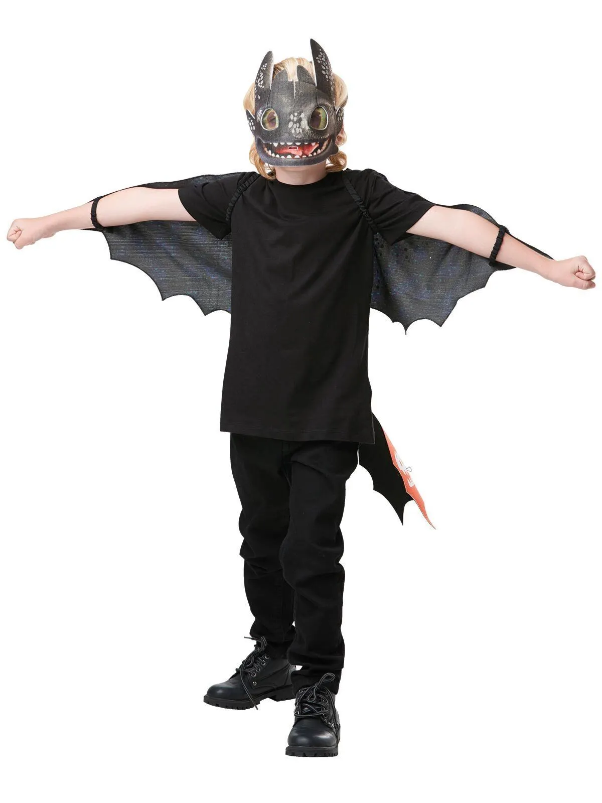 Available Online. For instore availability please call us on 07 3279 1555 Light Fury is the newest dragon to the Isle of Berk. Appearing for the first time in Universal’s “How to train your dragon 3: The Hidden World” (2019), Light Fury is the Dragon girlfriend of Toothless Night Fury. She is said to have abilities of firepower, cloaking, strength and intelligence, so become a Light Fury today and join in all the Nordic adventures with Hiccup and Astrid.INCLUDESWide span, sheer black cape wings with scalloped edging, straps at shoulder and wrists and attached felt tail with red tip detailWings have glow in the dark elements in the shape of dragon scalesMoulded plastic EVA mask with painted details, mesh eye holes and mouth hole. Mask has an elastic strap and velcro fastenMask has glow in the dark elements on forehead and earsThis is an officially licensed How To Train Your Dragon product