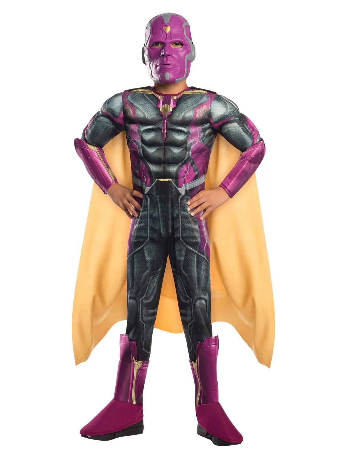 Available Online. For instore availability please call us on 07 3279 1555 The metal monstrosity called Ultron created the synthetic humanoid known as the Vision. Vision can fly, possesses complete control over his density and can partially materialise with other people. These powers will be yours in this ‘Marvel-lous’ Vision costumeINCLUDESJumpsuit with digitally printed bodice and fibre filled muscle chest with stitching detailFull length sleeves wuth digital print and attached 3D gauntletsPants with digital print and 3D boot topsMoulded mask with painted details and elastic band with velcro fasten, plus detachable cape with velcro fastenThis is an officially licensed Marvel product