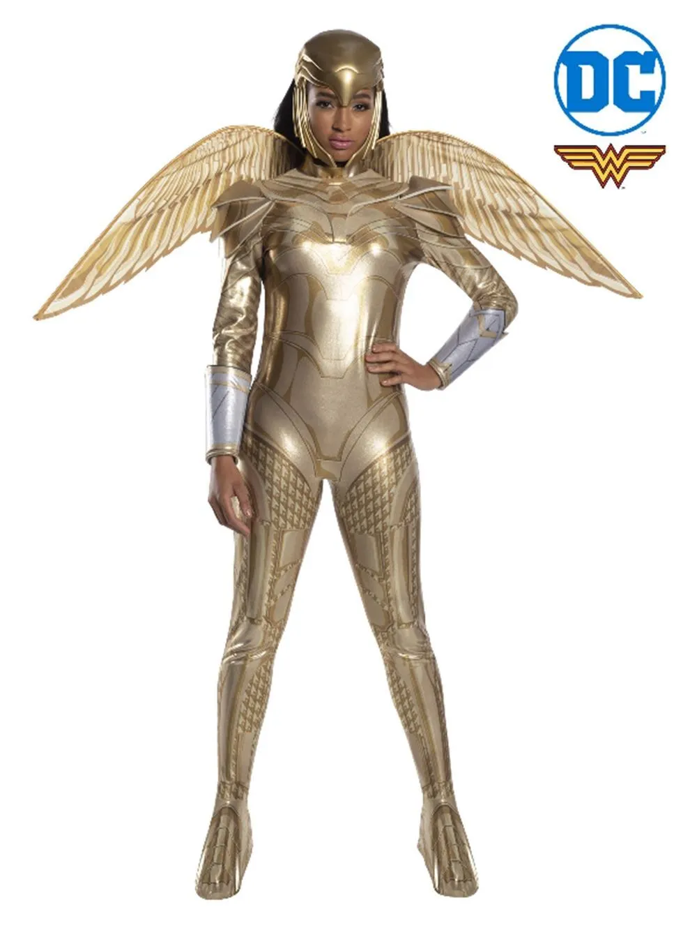 Available Online. For instore availability please call us on 07 3279 1555 Â Wonder Woman is Princess Diana of Themyscira, but she adopts the civilian identity of Diana Prince in daily life. The DC Super-heroine from the Amazonian Jungle, she has super-human strength and speed, and uses trusty weapons like her lasso of truth, her tiara and bullet-proof bracelets. She teams up with fellow heroes like Batman and Superman as part of the Justice League and takes on crime wherever it lurks. Portrayed as strong, sexy and smart, Wonder Woman has appeared in many Warner Bros movies as well as cartoons, TV series and video games. She is also a team member of the DC Superhero Girls along-side Batgirl, Supergirl and Harley Quinn. From the days of Lynda Carter on the small screen to Gal Gadot on the big screen in Batman Vs Superman: Dawn of Justice (2016), Wonder Woman (2017), Justice League (2017) and now the latest Blockbuster movie in 2020, Wonder Woman 1984. Get your powers on!INCLUDESDigitally printed jumpsuit in silver sparkle lycra material with attached foam armour on collar, shoulders and gauntlets, plus zipper at rear to closeJumpsuit has gold trim and print with silver highlights on the gauntletsShoe covers are attached to the jumpsuit and have elastic strap underneath to secure to shoesDetachable wings are made in taffeta fabric and on a wire frame to maintian shape. Velcro tabs to attach to jumpsuitGold painted headpiece is moulded plastic with an elastic strap at rear