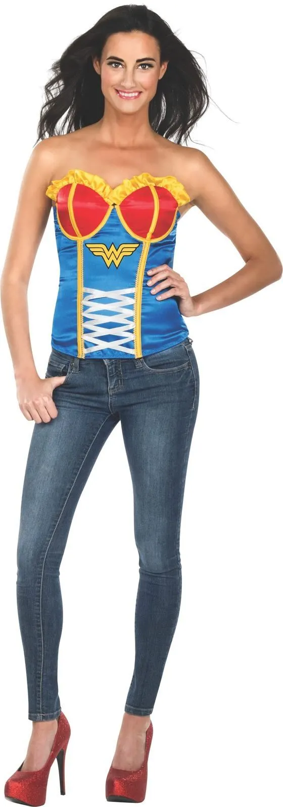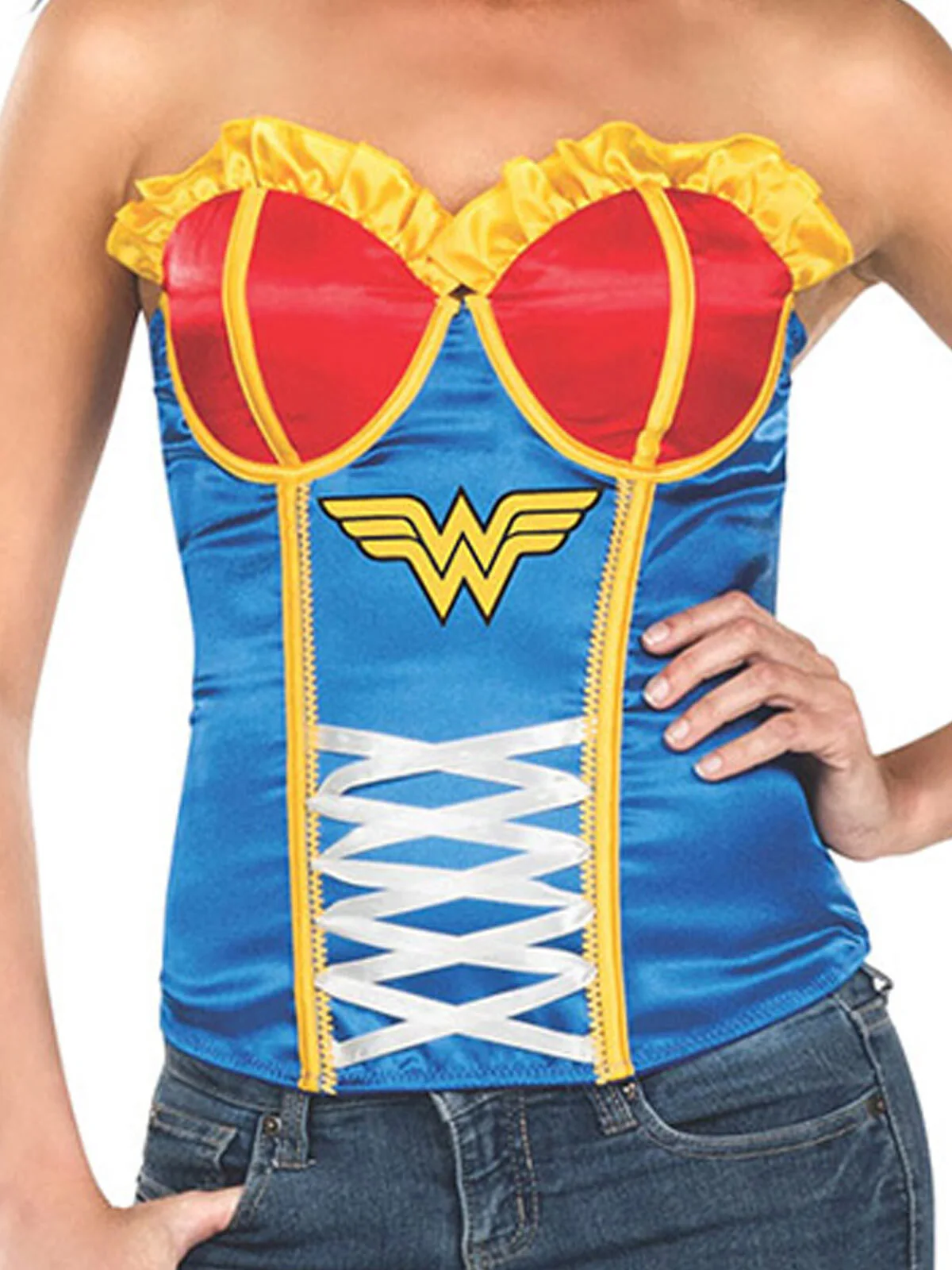 Available Online. For instore availability please call us on 07 3279 1555 Wonder Woman is Princess Diana of Themyscira, but she adopts the civilian identity of Diana Prince in daily life. The DC Super-heroine from the Amazonian Jungle, she has super human strength and speed, and uses trusty weapons like her lasso of truth, her tiara and bullet-proof bracelets. She teams up with fellow heroes like Batman and Superman as part of the Justice League and takes on crime wherever it lurks. Portrayed as strong, sexy and smart, Wonder Woman has appeared in many Warner Bros movies as well as cartoons, TV series and video games. She is also a team member of the DC Superhero Girls along-side Batgirl, Supergirl and Harley Quinn. From the days of Lynda Carter on the small screen to Gal Gadot on the big screen in Batman Vs Superman: Dawn of Justice (2016), Wonder Woman (2017) and Justice League (2017).INCLUDESSatin corset with boning down bodice frontSatin frill over sweetheart necklineRibbon crossover detail on front middle panelPrinted Wonder Woman emblem under bustierThis is an officially licensed DC Comics product