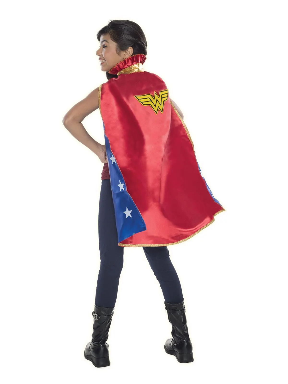 Available Online. For instore availability please call us on 07 3279 1555 Wonder Woman is Princess Diana of Themyscira, but she adopts the civilian identity of Diana Prince in daily life. The DC Super-heroine from the Amazonian Jungle, she has super human strength and speed, and uses trusty weapons like her lasso of truth, her tiara and bullet-proof bracelets. She teams up with fellow heroes like Batman and Superman as part of the Justice League and takes on crime wherever it lurks. Portrayed as strong, sexy and smart, Wonder Woman has appeared in many Warner Bros movies as well as cartoons, TV series and video games. She is also a team member of the DC Superhero Girls along-side Batgirl, Supergirl and Harley Quinn. From the days of Lynda Carter on the small screen to Gal Gadot on the big screen in Batman Vs Superman: Dawn of Justice (2016), Wonder Woman (2017) and Justice League (2017).INCLUDES6+Red satin cape with velcro fasten at neckRuffle collar on neckline with gold trimLarge Wonder Woman logo on back of capeGlitter trim edging and iconic blue lining with star print