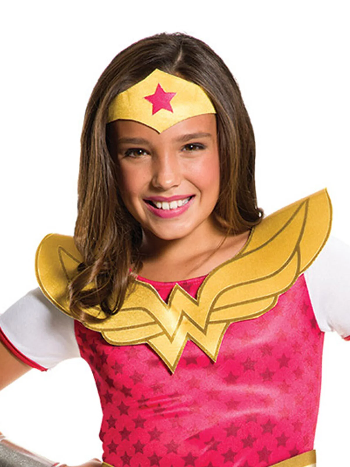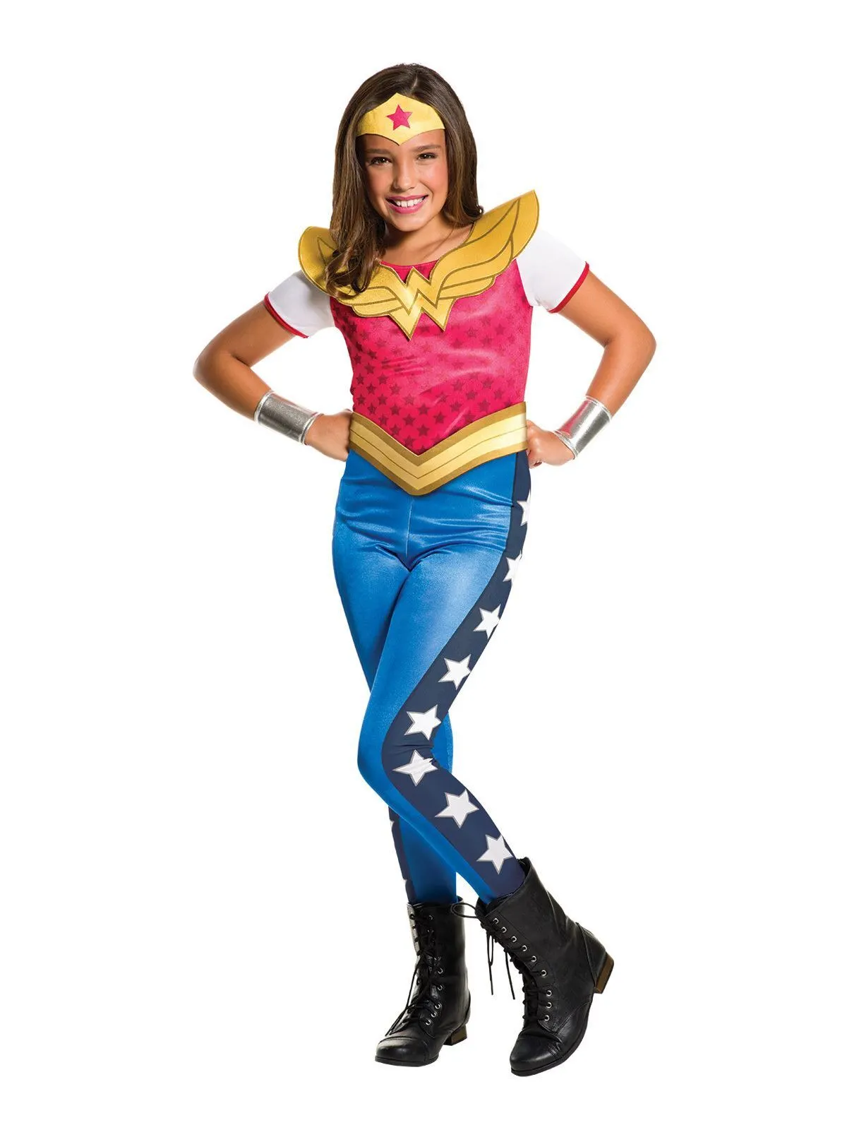 Available Online. For instore availability please call us on 07 3279 1555 Â Wonder Woman is Princess Diana of Themyscira, but she adopts the civilian identity of Diana Prince in daily life. The DC Super-heroine from the Amazonian Jungle, she has super human strength and speed, and uses trusty weapons like her lasso of truth, her tiara and bullet-proof bracelets. She teams up with fellow heroes like Batman and Superman as part of the Justice League and takes on crime wherever it lurks. Portrayed as strong, sexy and smart, Wonder Woman has appeared in many Warner Bros movies as well as cartoons, TV series and video games. She is also a team member of the DC Superhero Girls along-side Batgirl, Supergirl and Harley Quinn. From the days of Lynda Carter on the small screen to Gal Gadot on the big screen in Batman Vs Superman: Dawn of Justice (2016), Wonder Woman (2017) and Justice League (2017).INCLUDESJumpsuit with digitally printed star pattern on bodice, collar in logo shape and short sleeves with contrast edgePants with printed detail including stars and stripeShaped belt with printed details and velcro fasten plus metallic gauntletsShaped headpiece and printed star and elastic strap with velcro fastenThis is an officially licensed DC Comics product