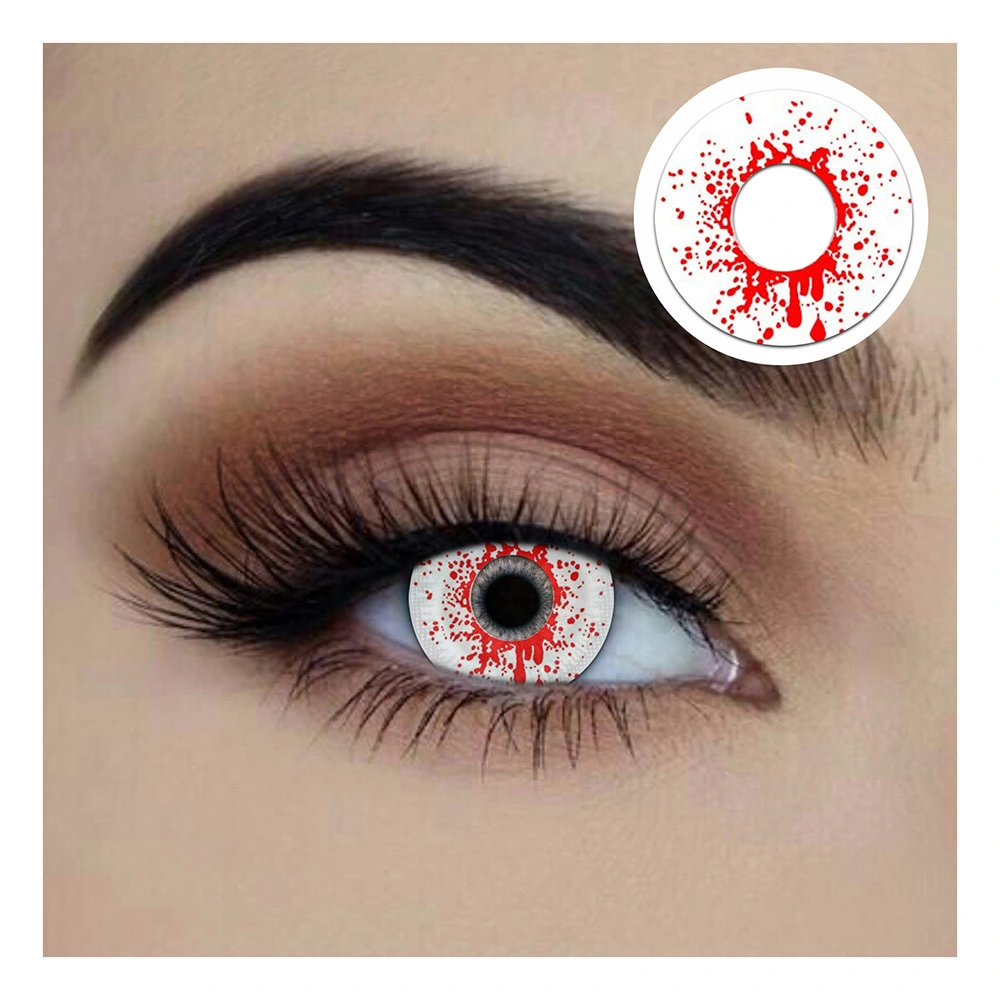 Includes 1 Pair of Starry Eyed Yearly Lenses Design: Blood Splatter 12 months use coloured contact lenses Australian Owned Contents: 2 Sterile Soft Eye Lenses Ingredients: 2-hydroxyethel methacrylate, Carbodiimide, Crosspolymer, Sterile Saline