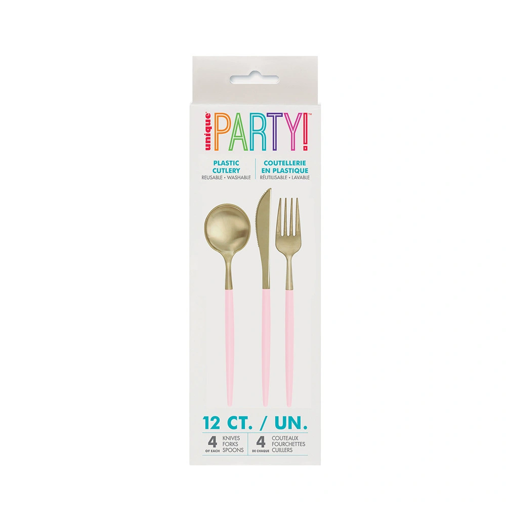 Includes 12 Black & Lovely Pink Assorted Reusable Cutlery Contains: 4 x Spoon 4 x Fork 4 x Knife High-quality Perfect accessory for your theme parties Coordinate with other party supplies and party decorations