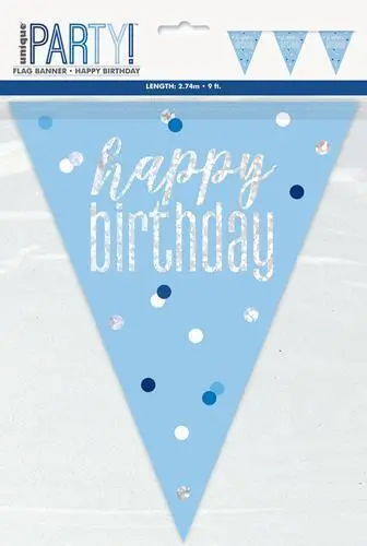 Unique Blue Prismatic Foil Flag Banner – Happy Birthday 2.74m